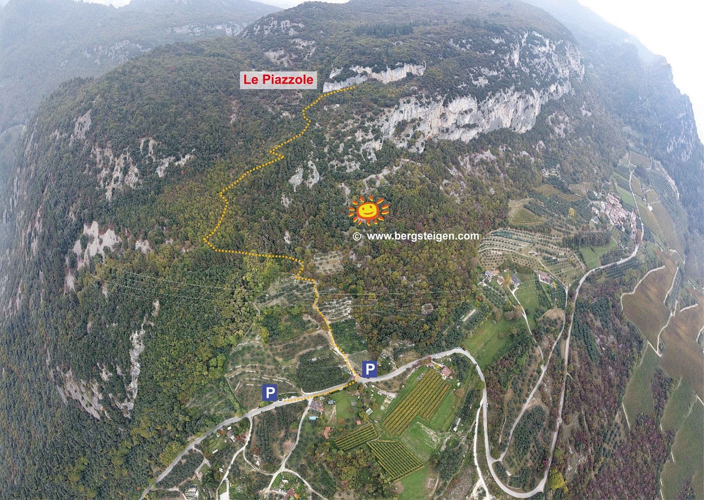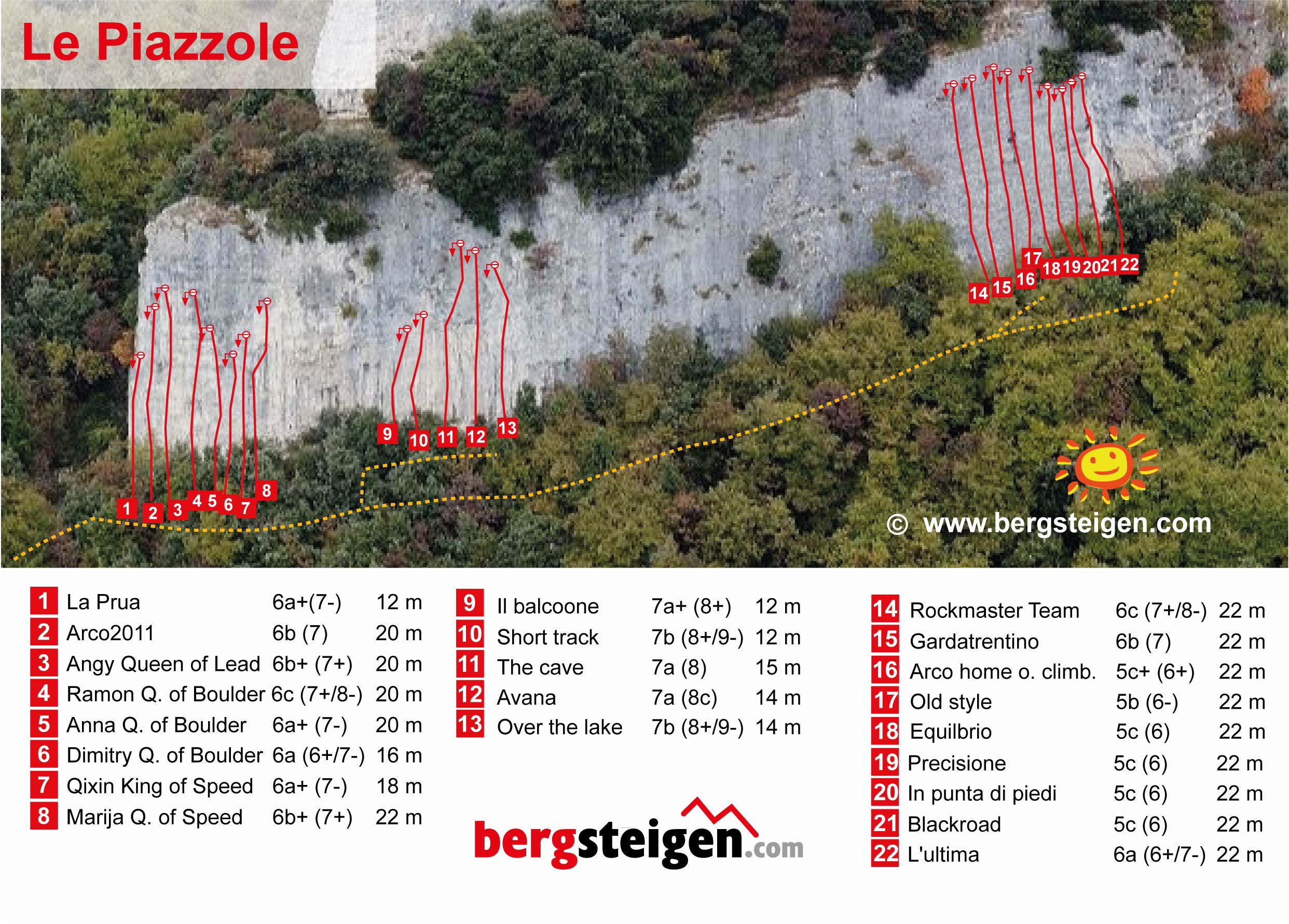 Die Falesia Piazzole ist ein sehr schöner und sonniger Klettergarten in der Nähe von Arco. Der Klettergarten befindet sich über dem Örtchen Varignano und ist rau, perfekt abgesichert und bietet großartige Routen im Bereich 6-8. Eine Perle unter den Klettergärten rund um Arco, mit viel Potenzial für Neutouren a la Massone im rechten Wandteil!