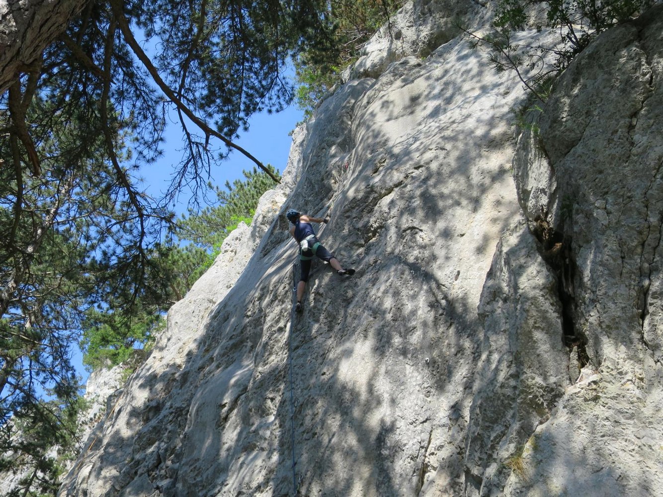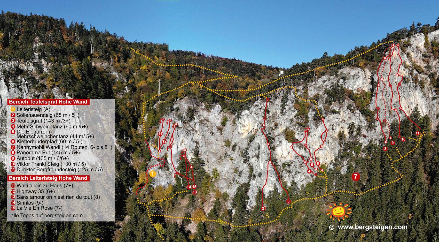 Schöner Klettergarten rechts vom Teufelsgrat. Die Routen sind, bis auf Nr. 5 und 10, von der Art her eher „oldschool“ (Diffizile, glatte Wand- und Plattenkletterei)! Wand trocknet nach Regen sehr rasch auf. Im Winter Klettern vor Mittag teilweise möglich (dem Baumschatten ausweichend). Im Hochsommer ist das Wandl nicht empfehlenswert (Schatten ab 16h).