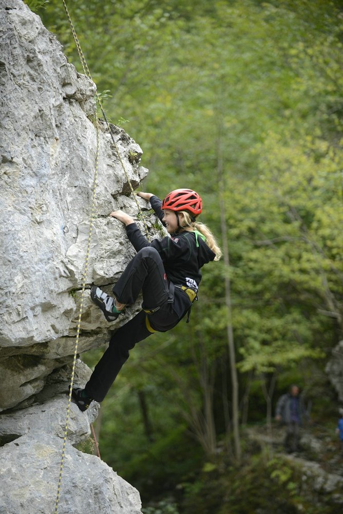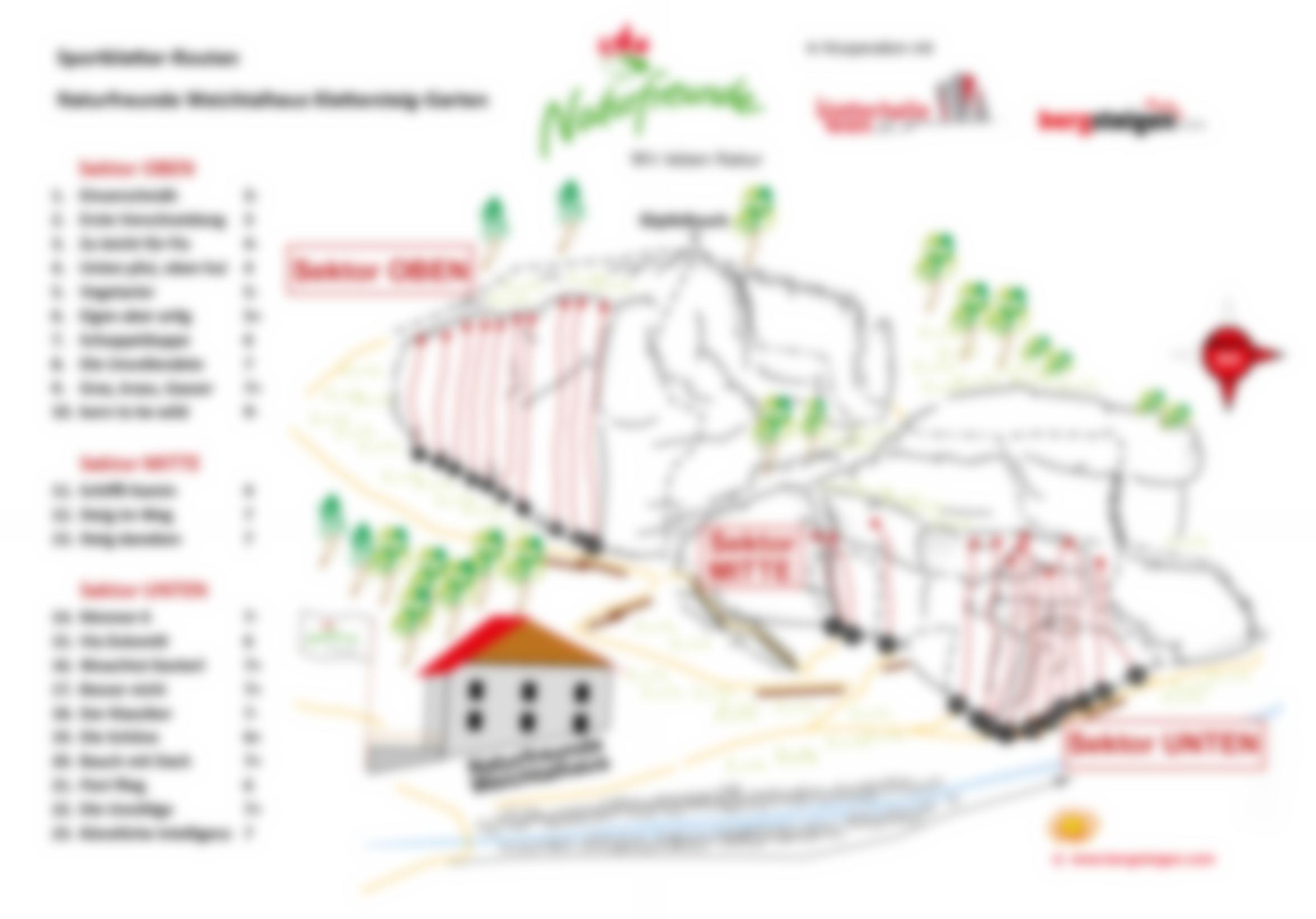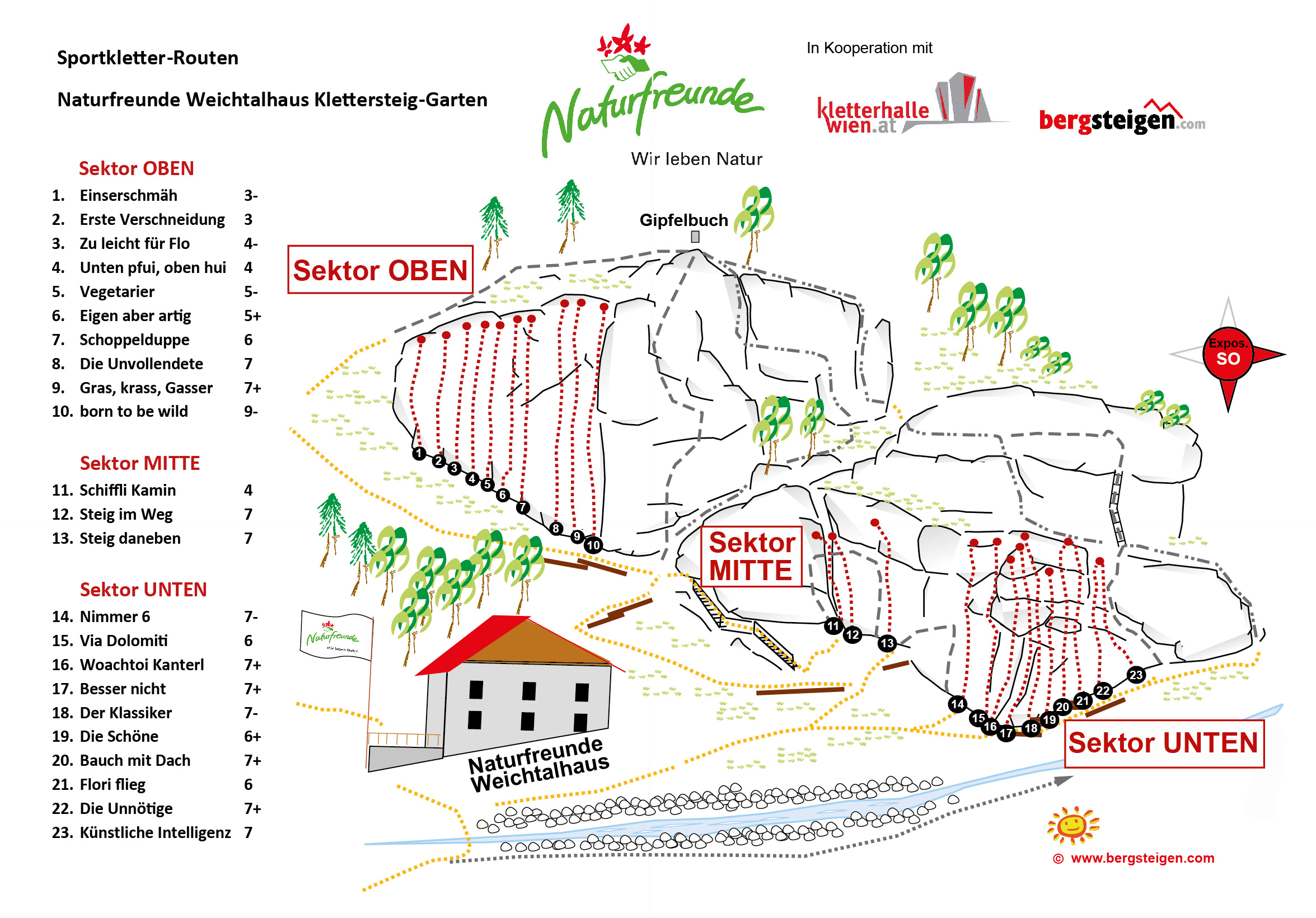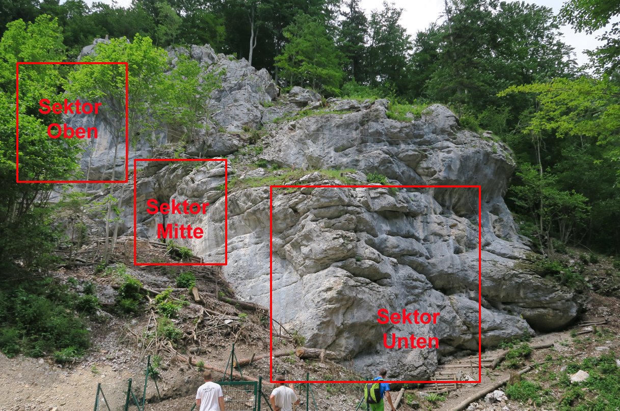 Idealer Übungs- und Anfängerklettergarten direkt hinter dem Naturfreunde Weichtalhaus mit 23 perfekt gesicherten Routen 6 bis 20 Meter lang, die Schwierigkeit ist überwiegend der 7te Grad. Eine gute Gelegenheit, die ersten Schritte am Fels zu wagen oder in den nächst höheren Schwierigkeitsgrad hineinzuschnuppern. An den Felsen sind auch (auf dem Topo grau eingezeichnet) vier kurze Übungsklettersteige, deshalb sollte man in diesem Klettergarten immer mit Helm klettern! Die Schwierigkeit der Klettersteige reicht von B/C bis E/F, das entsprechende Topo dazu gibt es im Weichtalhaus. Bei unsicherem Wetter auf der Rax ist der Klettergarten eine tolle Ausweichmöglichkeit und in max. fünf Minuten vom Auto aus erreichbar. Im direkt darunter liegenden Weichtalhaus kann man auch Zuflucht suchen. Diese Anlage ist perfekt für Kurse oder für eine letzte kurze sportliche Aktivität vor dem verdienten Bier.