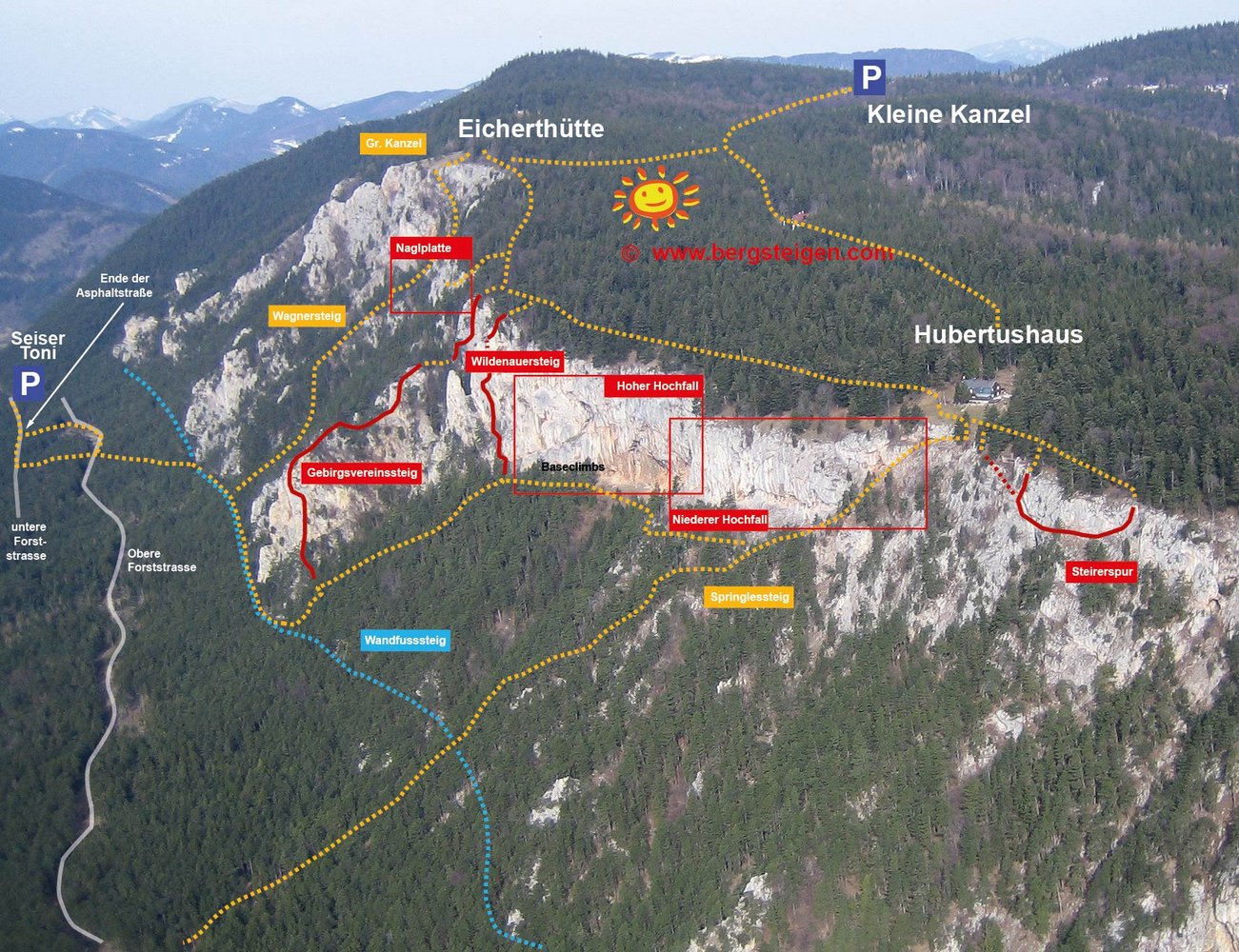 Vom Parkplatz folgt man der Straße noch bis zur nächsten Abzweigung (ca. 150 m) und geht über den markierten Springlesteig bis unter die Wand (vor der Eisenleiter). 30 min. Alternativ kann man über die Hohe Wand Mautstraße bis zur Kl. Kanzel fahren und in 30 min. eben zum Hubertushaus gehen.