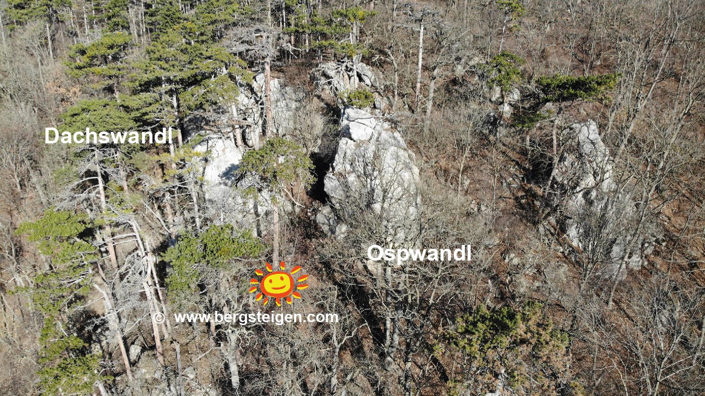 Sehr kleine Felsbildungen im dichten Wald. Das Ospwandl bietet überhängende und schwierige bis 8 m hohe Kletterei. Das Dachswandl ist weniger steil und stellenweise plattig. Das Dachswandl wurde von Christian Hacker eingerichtet, das Ospwandl von Roman Patlik 1993.