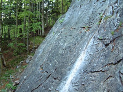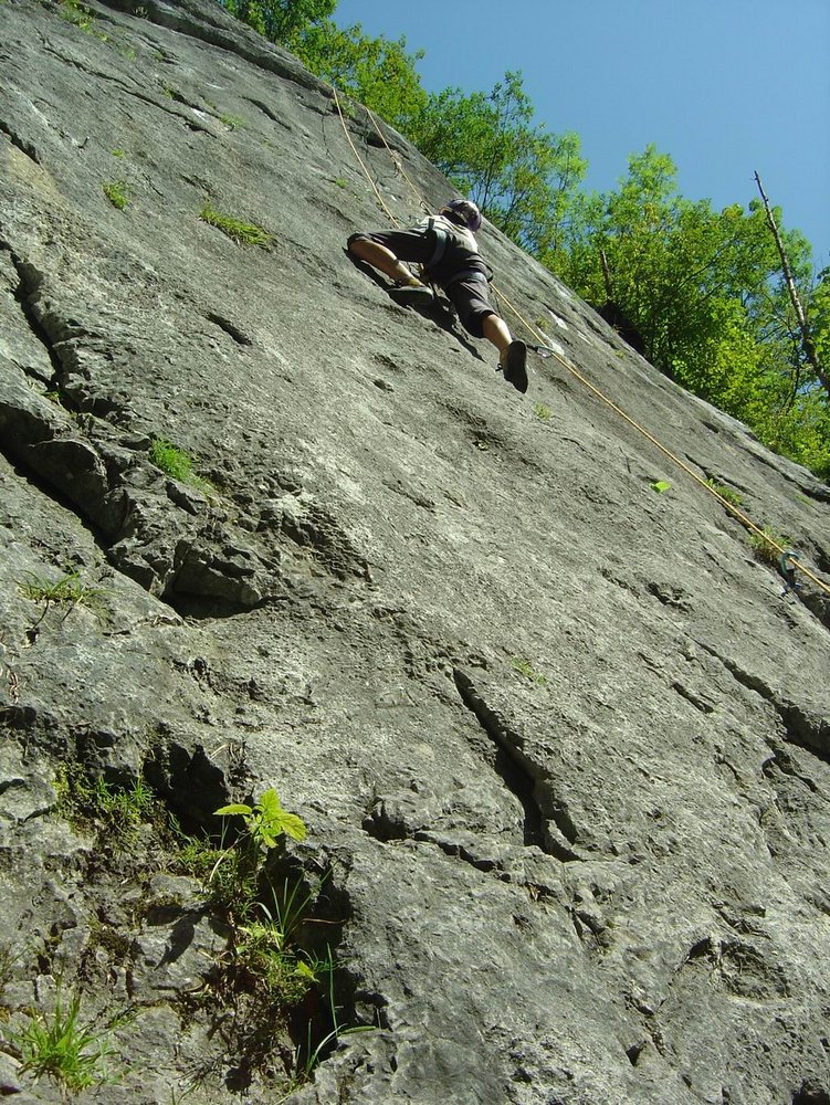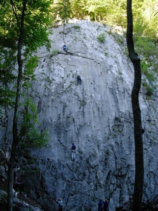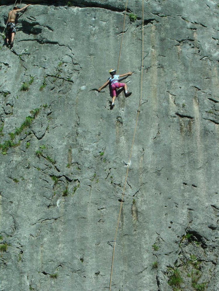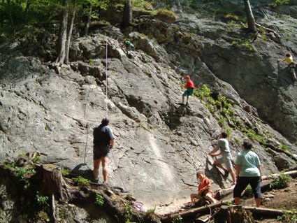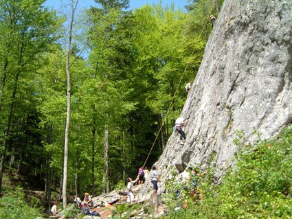 Dieser wunderschön gelegene Klettergarten im Salzkammergut bietet perfekte Touren, auch für den Anfänger. Die Routen sind meist neu mit Klebehaken eingebohrt und der Name und die Schwierigkeit am Einstieg auf einer kleinen Tafel angeschrieben (bei den älteren, meist schwereren Route ist dieses Täfelchen leider etwas hoch oben, und es kann schon vorkommen, daß man die Schlüsselstelle schon geschafft bevor man die Schwierigkeit und den Namen lesen kann...). Gleich am Anfang gibt es einen netten Sektor (mittleres Foto) der vor allem für Anfänger und Kinder perfekt eingerichtet ist. Hier läßt es sich also unbeschwert klettern, Haken manchmal im "1 Meterabstand". Etwas links vom Sektor mit den Kinderkletterrouten gibt es einige gute Ausdauerrouten, der Routenname "Schmalzbettler" ist aussagekräftig genug.