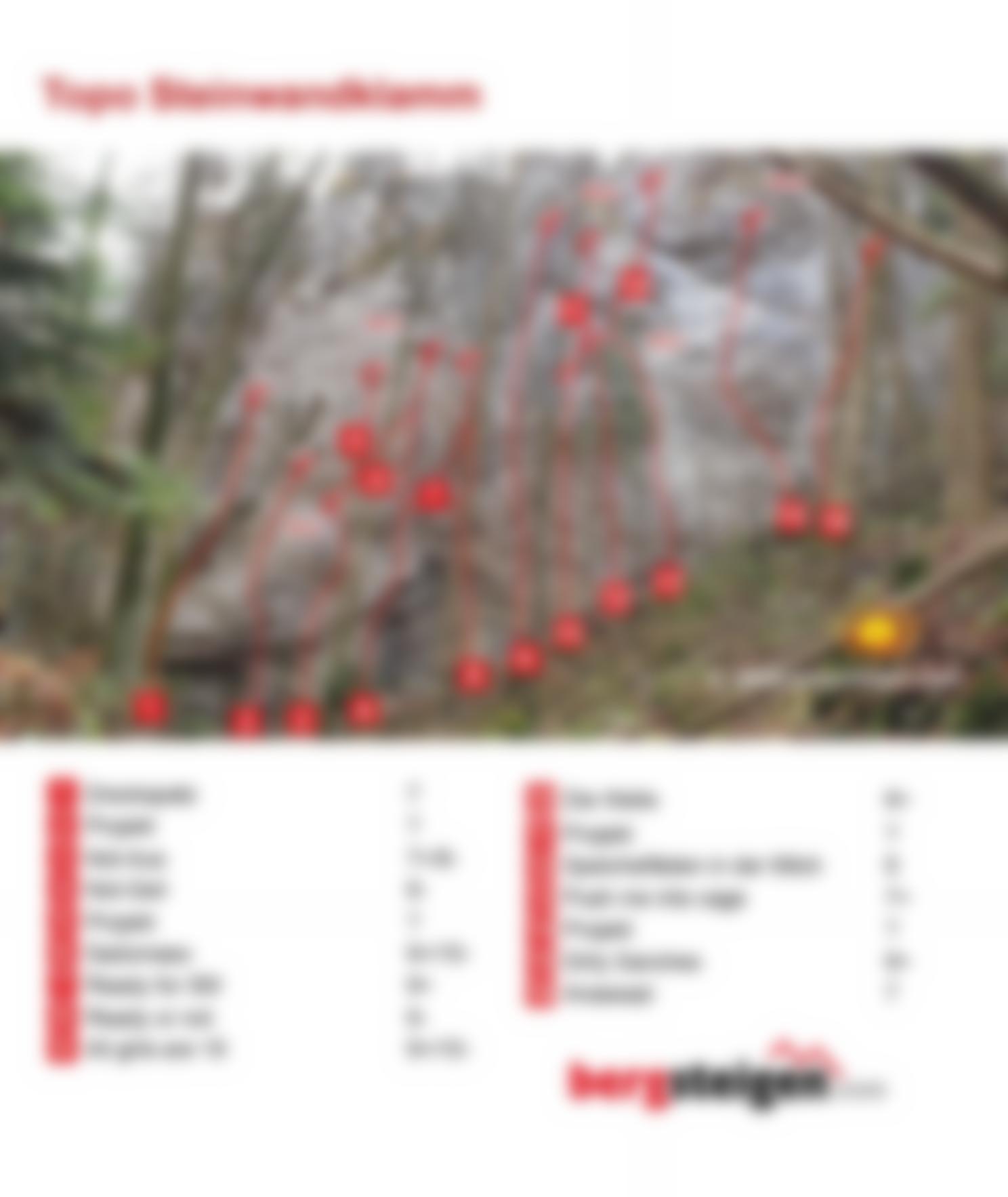 Zwischen Muggendorf und Furth liegt mit der Steinwandklamm ein beliebtes Ausflugsziel. An deren nördlichen Ende ist eine tolle, steile und glatte Wand mit ca. 15 Routen im oberen Schwierigkeitsgrad.