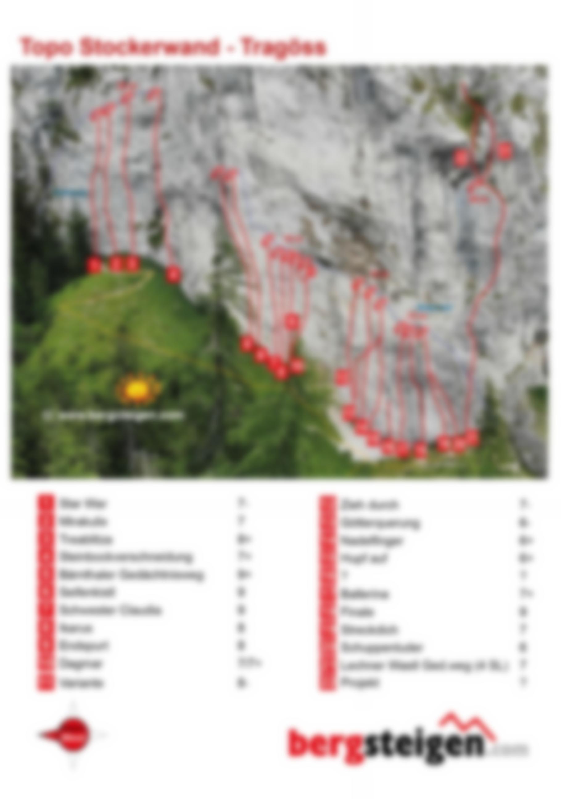 ACHTUNG: Der Klettergarten ist durch den darüber verlaufenden Stockerwandsteig und einem Gämsen-Einzugsgebiet steinschlaggefährdet. Es wird empfohlen, mit Helm zu klettern. Daher auch trotz des gutmütigen Einstiegsbereichs nicht kinderfreundlich.