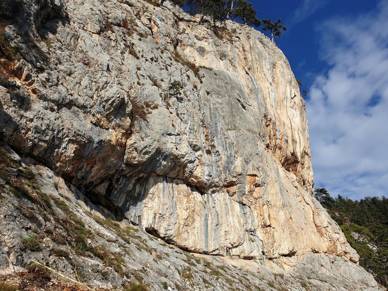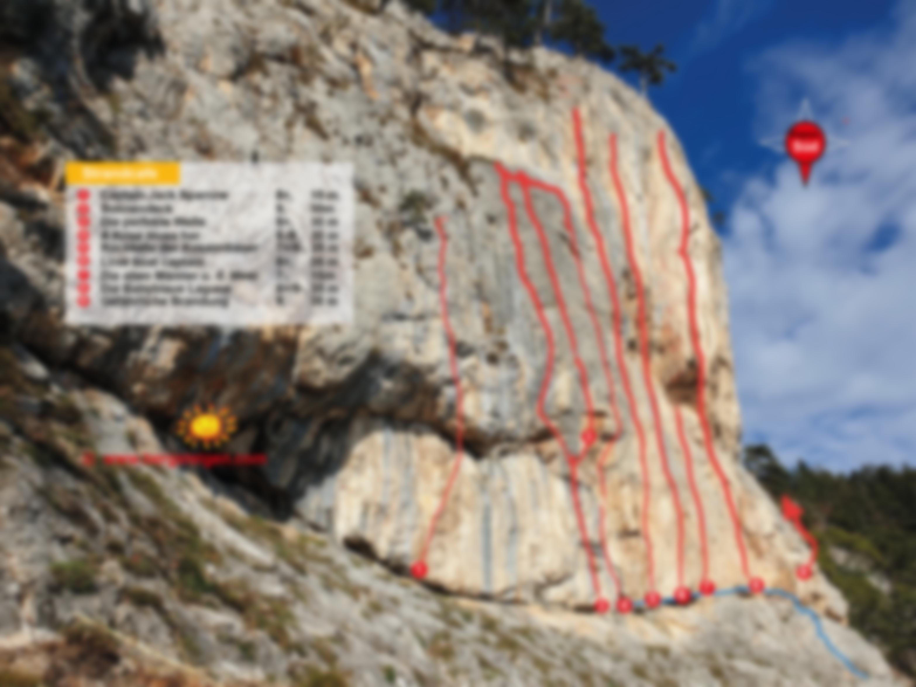 Kleiner aber feiner und inbes. auch bei Sonne sehr warmer Klettergarten unter einer Hammerwand mit derzeit 9 Routen zwischen 7- und 9. Entdeckt von Karl Kosa und überwiegen erschlossen von J. Friedl, L. Holzer und L. Vogler