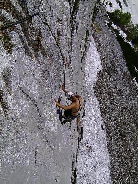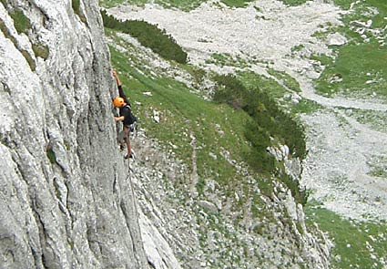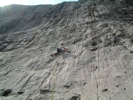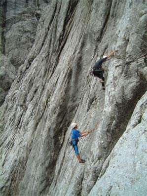 Schöner Klettergarten mit vielen bis zu 4 Seillängen langen Routen. Perfekter Wasserrillen-Fels (nur in der ersten Seillänge etwas glatt...) und sehr gute Absicherung machen das Klettern zum Genuß. Die Schwierigkeit ist im Plaisir-Niveau angesiedelt (meist 5 - 6+), was zur Folge hat, dass die Wand an guten Tagen meist sehr gut besucht ist. Es gibt auch noch andere interessante Routen in dieser Region, Infos gibt es auf der Hütte. Die Routen sind zum Teil angeschrieben, es kann bei jedem Stand abgeseilt werden.