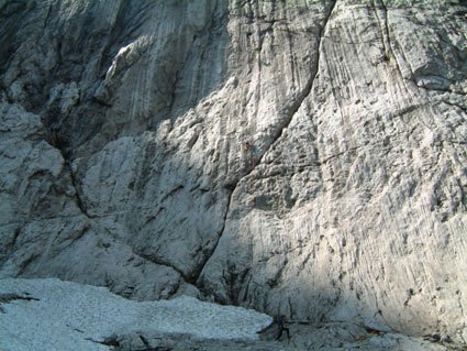 Von der Griesener Alm in Richtung Stripsenjoch bis in den "Wildanger", das ist ein Flachstück vor der letzten Steigung zur Hütte. (Abzweigung des Eggersteiges in Richtung Ellmauer Tor). Nun links ab Richtung Schlucht zwischen Fleischbank und Totenkirchl (meist Schneereste), die rechte Begrenzungswand ist das Ziel (5 - 10 min von der Abzweigung)