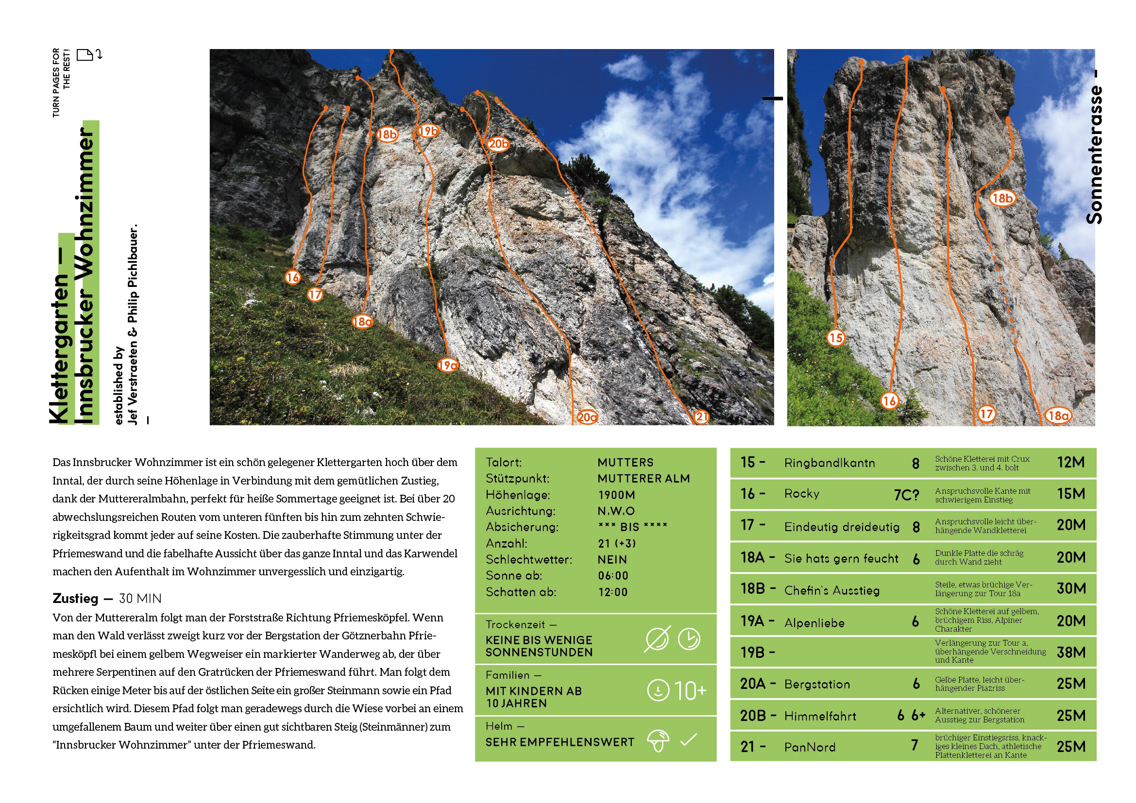 Das Innsbrucker Wohnzimmer ist ein schön gelegener Klettergarten hoch über dem Inntal, der durch seine Höhenlage in Verbindung mit dem gemütlichen Zustieg, dank der Muttereralmbahn, perfekt für heiße Sommertage geeignet ist.