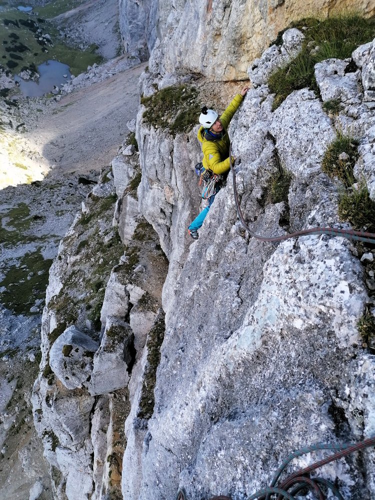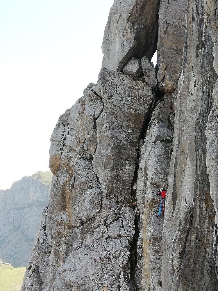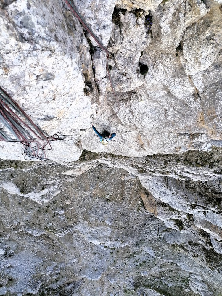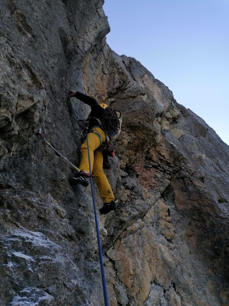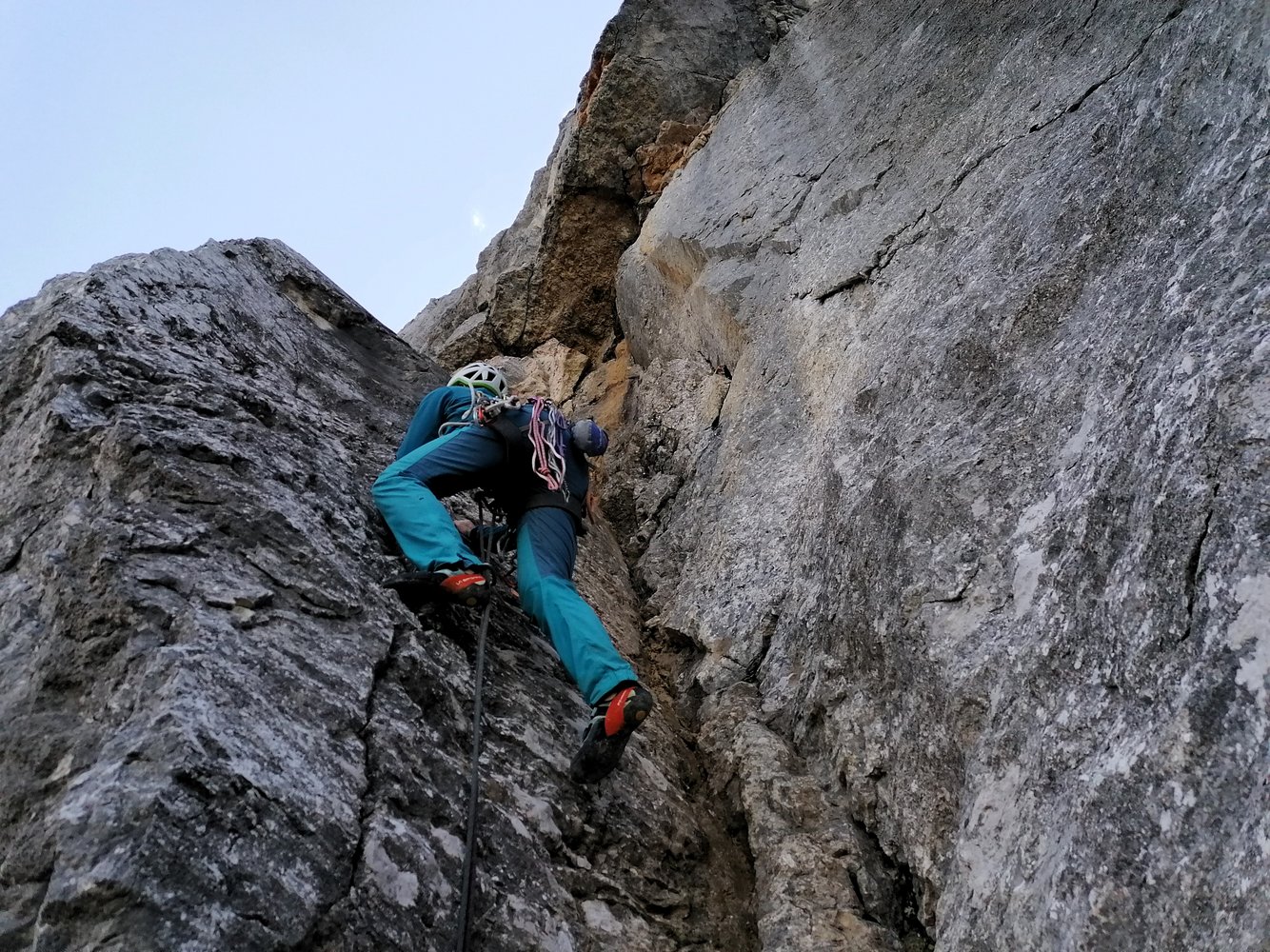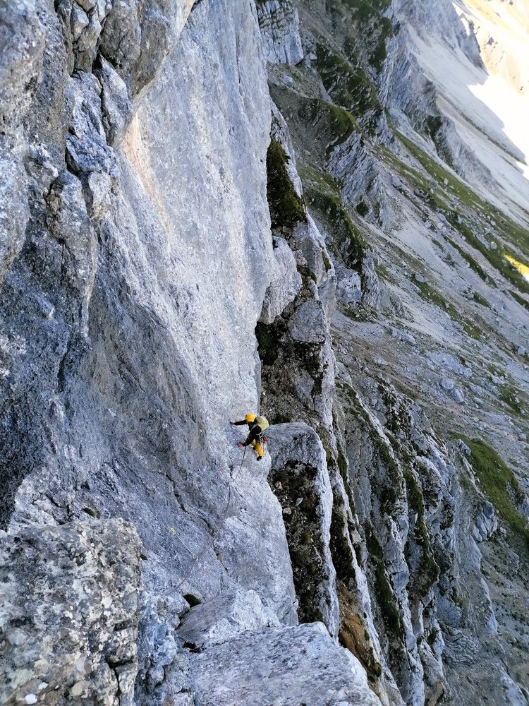 Überall dort, wo der Schwierigkeitsgrad hoch ist, ist die Route sehr gut mit Bohrhacken gesichert. In einer Seillänge ist der solide Umgang mit mobilen Sicherungen empfehlenswert. Wobei der Schwierigkeitsgrad in dieser niedrig ist und die mobilen Sicherungen einfach zu platzieren sind. Die Route ist sehr vielfältig und bietet die perfekte Kombination aus schwieriger Kletterei mit bester Absicherung und ein wenig alpiner Eigenverantwortung – passend für alpine AspirantInnen.