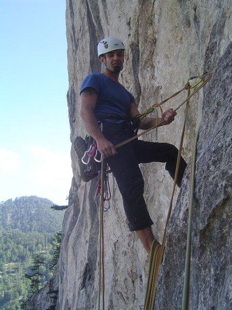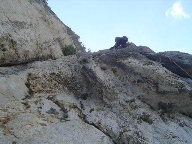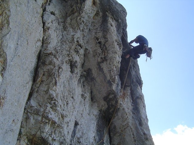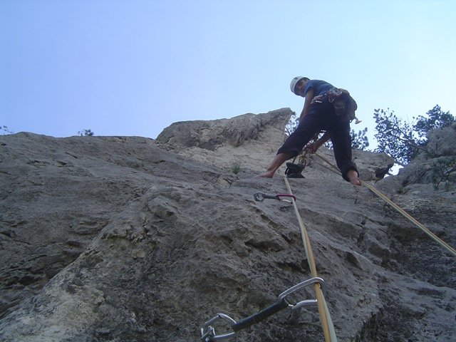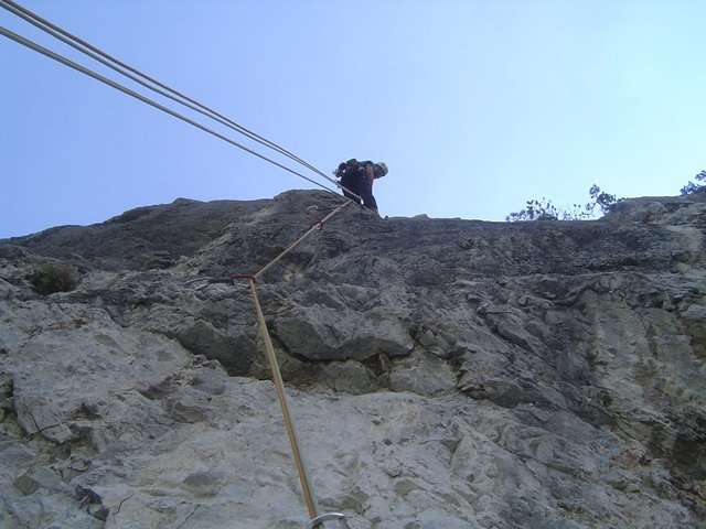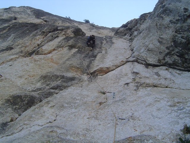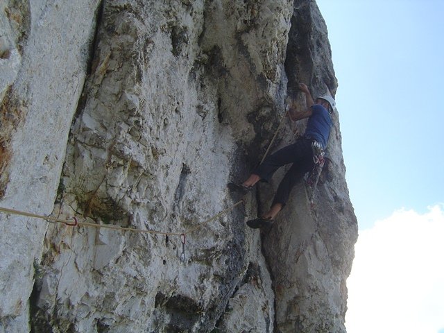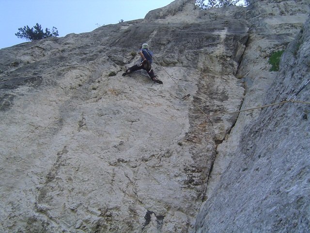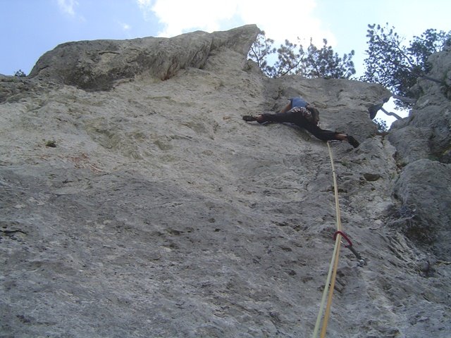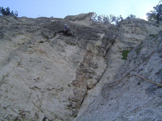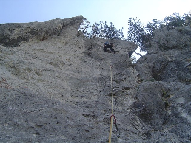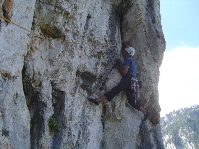 Diese Route in der Blechmauer ist eine ganz neue super Linie im Bereich der Blechmauernverschneidung. Die Route ist ganz im "Plaisir Stil" gesichert, dass heißt man braucht nur Expreßschlingen und Helm. Der Fels muß aber noch etwas abgeklettert werden (bei uns lösten sich durch Berührung mit der Kletterhose die Schuppen, also Helm nicht vergessen). Die Erstbegeher setzten dafür aber sehr viele Bohrhaken, sonst wären sie wohl mit dem Putzen heute noch nicht fertig. Man sollte den siebten Grad aber beherrschen, um in dieser Route auf seine Rechnung zu kommen.