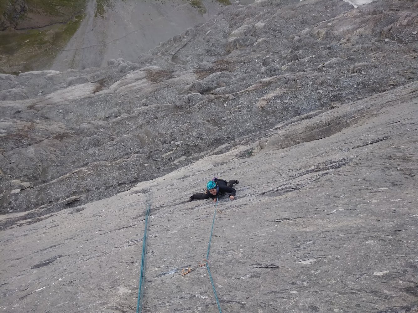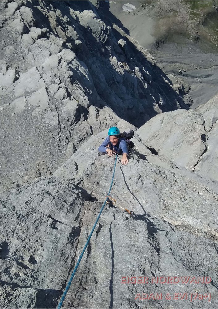 Alpine Sportklettertour, die sehr viel Abwechslung bietet. Von der Knallerplatte zu griffiger Wandkletterei, über henklige Überhänge zu fantastischem Lochfels, wasserzerfressenem Crimpy‐Gelände, ein paar griffigen Rissen und sogar rätikonartigem Plattenkalk ist fast alles vorhanden. Die Felsqualität ist über weite Strecken sehr gut bis hervorragend. Wie überall am Eiger liegt hier und da etwas loses Geröll auf den Bändern und Griffausbruch‐Spezialisten werden die Möglichkeit finden, ihr Metier zu praktizieren.