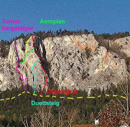 Schöner und belieber Klassiker, die die Touren Turnerbergsteigersteig und Draschgrat derart verbindet, dass man nicht schwerer als 4- klettern muss. Im unteren Teil des Turnerbergsteigers warten Kamine, es folgt eine Querung zum Draschgrat. Hier wird die Schlüsselstelle links über eine schöne Platte umgangen über die letzte SL ausgestiegen.