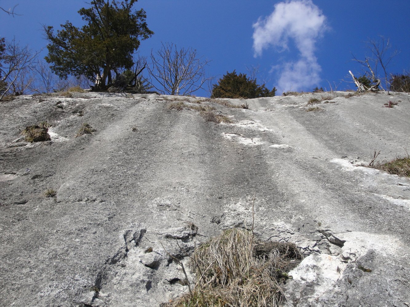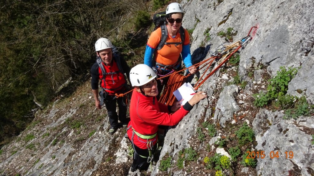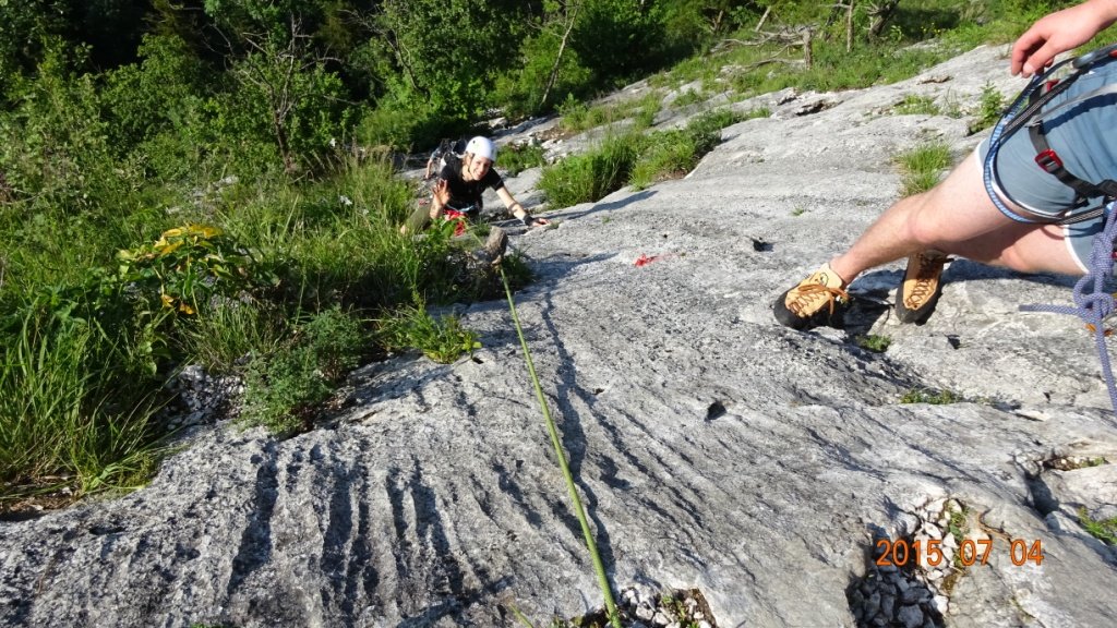 Vom Ausstieg den Steigspuren nach rechts bis zum Wanderweg folgen. Diesen bergab und der Wand entlang bis man kurz vor dem Sattel zur Hangelschuppe (4, eine Seillänge) kommt, sehr empfehlenswerte Draufgabe! Weiterer Abstieg wie Zustieg.