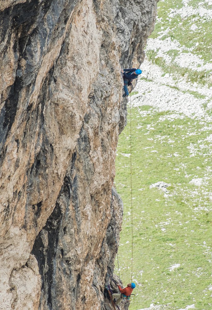 70 m Einfachseil, 12 Expressschlingen - keine mobilen Sicherungen notwendig. Alle Standplätze sind zum Abseilen eingerichtet.