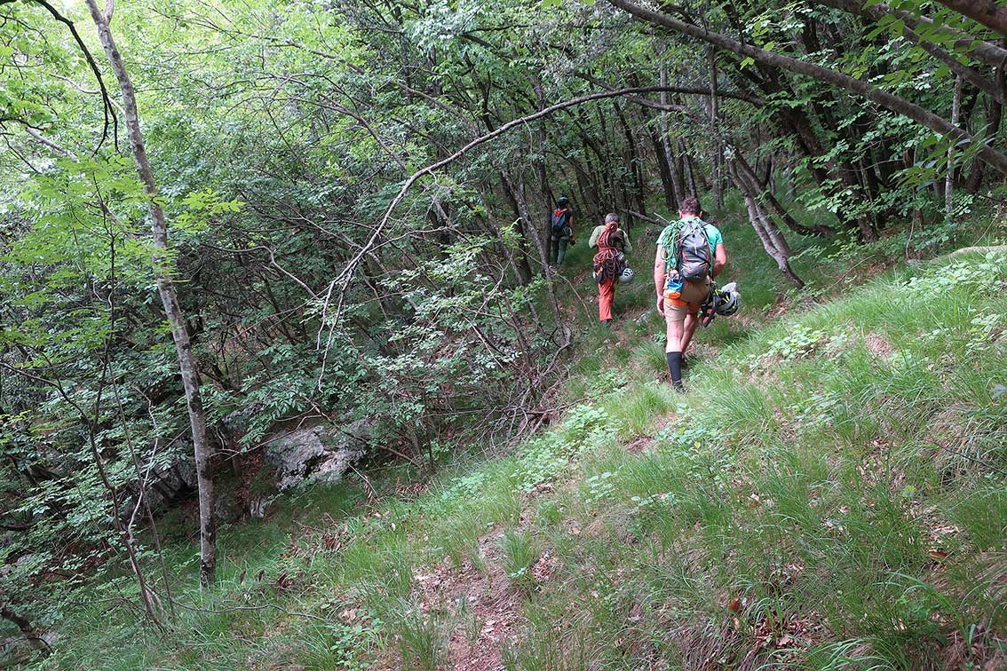 Vom letzten Standplatz an Fixseil zu einer Felswand (Buch), dort rechts dem Pfad (rote Punkte und Fixseile) bis über eine Felsstufe folgen. Dort dann links zu einem breiten Weg auf dem wieder hinunter zum Querweg abgestiegen wird.