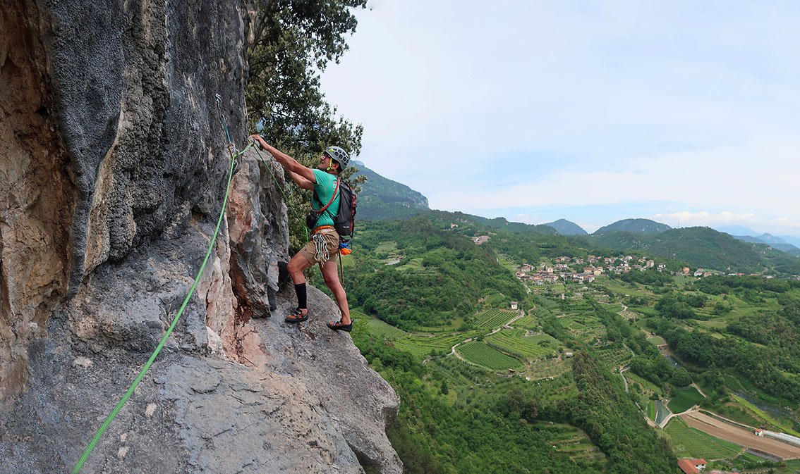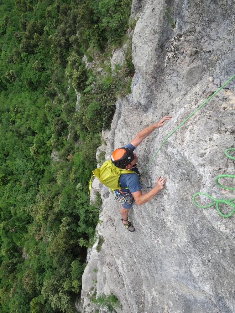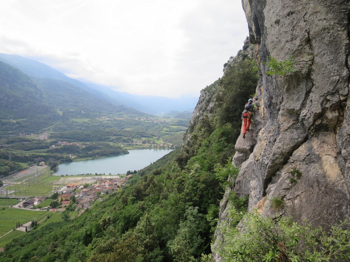 Die Route Alba Corallina zeichnet sich durch wirklich fantastischen Fels aus. Über Risse, raue Platten und Verschneidungen und kleine Überhänge klettert man an den linken Rand der Rupa di Santa Massenza. Eine lohnende, von den Erstbegehern wirklich gut herausgearbeitete Tour im hinteren Sarcatal.
