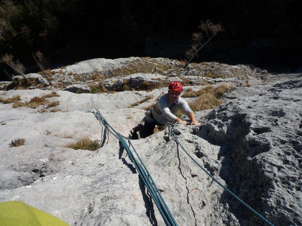 Über Tour abseilen und den Zustieg zurück. (siehe Topo).