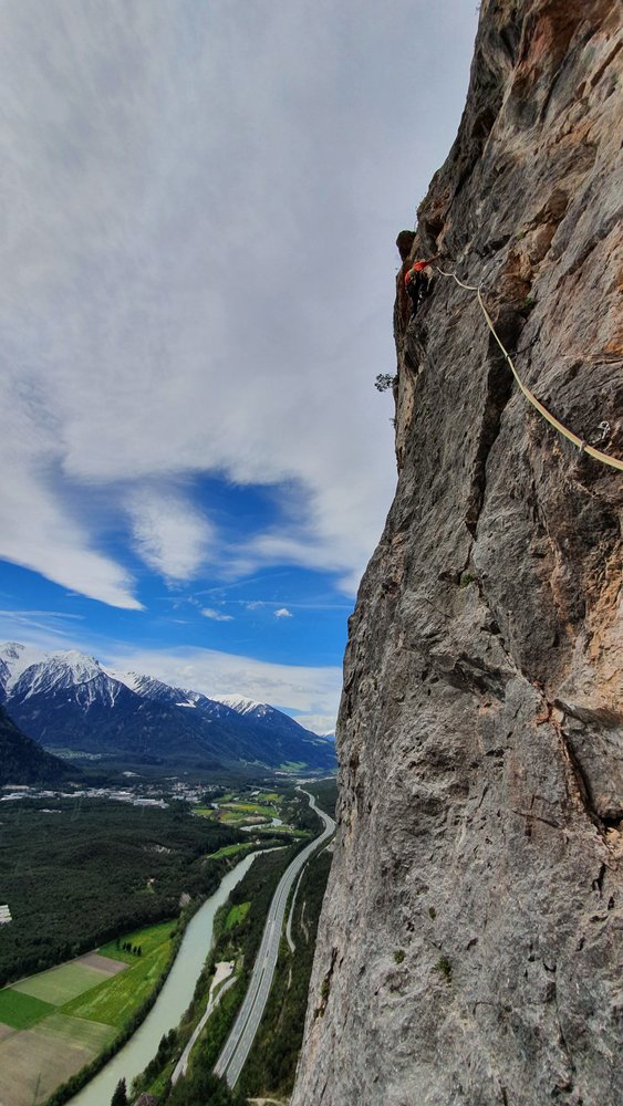 Schöne und sehr beliebte Genusskletterei an der Geierwand. Unten beherrschen raue Platten das Geschehen, nach oben hin wird die Kletterei immer schwerer, steiler, ausgesetzter und es sind unzählige Grifflöcher vorhanden. In der 10. Seillänge kommt zuletzt eine kurze schwere Passage (Querung zum Stand, 6/6+), die sich aber technisch gut klettern lässt.