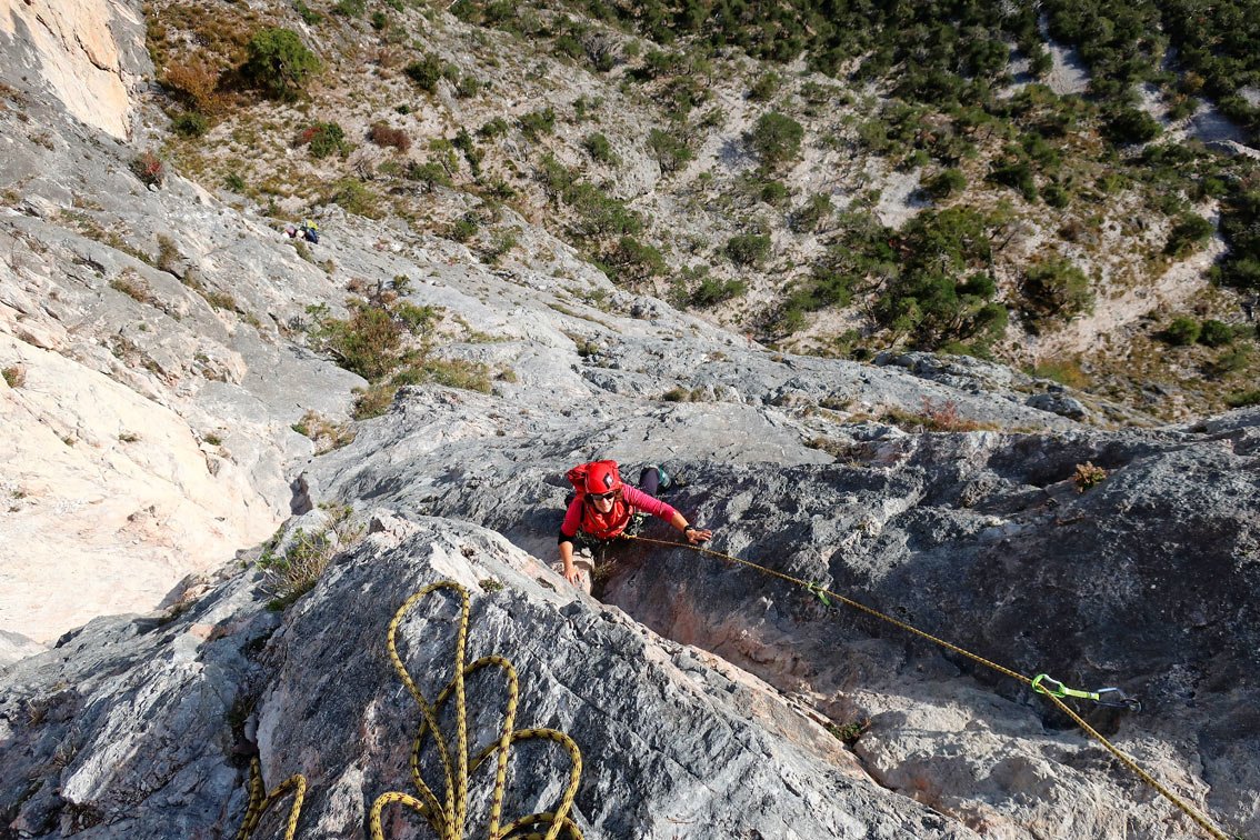 2 x 60 m Doppelseil oder 1 x 70 m Einfachseil, 12 Expressschlingen und Helm