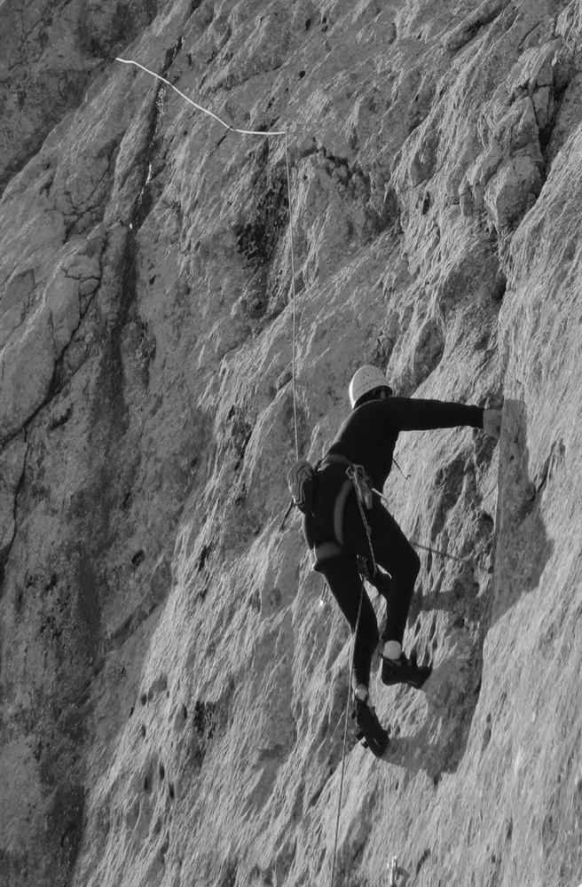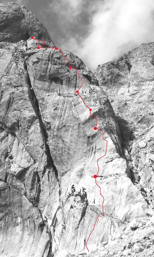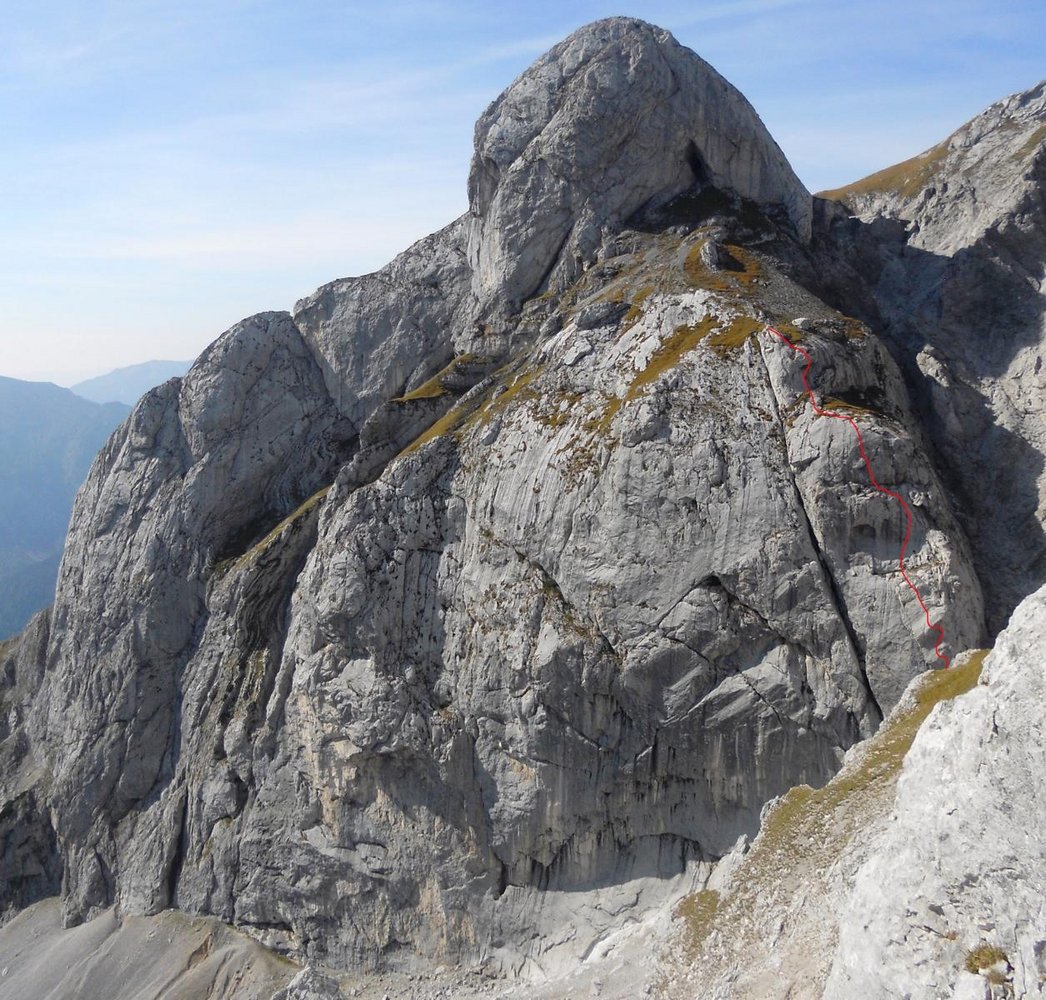 Die Originalroute wurde nun von Peter Pesendorfer nach oben und unten hin verlängert. Die Schlüssellänge weist einen neuen vorteilhaft zu nutzenden Zwischenstand aus. Die Seillänge oberhalb des schönen 4er Risses wurde in die kompakte Platte (rechts der Originalline) verlegt.