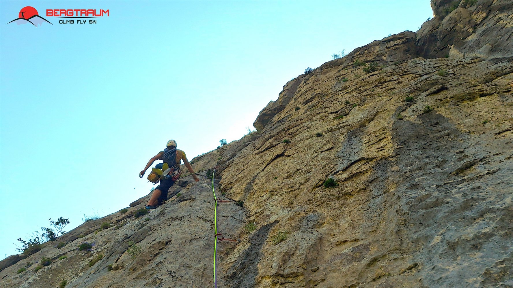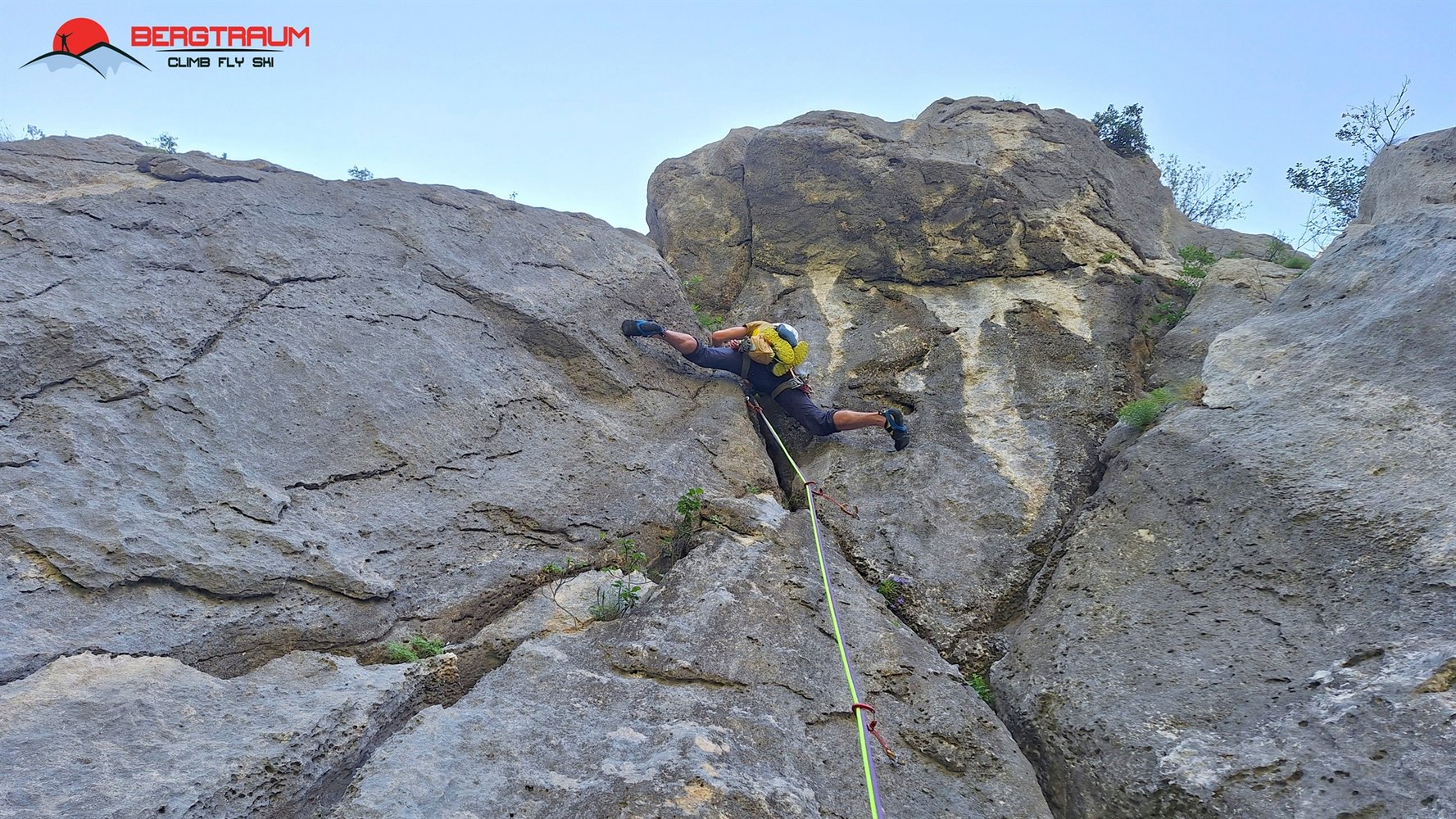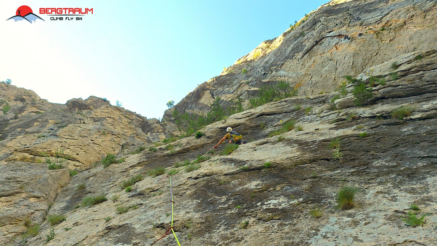 L7- 6b+: Die markante Rampe kurz rechts rauf verfolgen, dann senkrecht rauf über kleinen Überhang (weiter Zug nach links…) weiter und über eine herrliche Platte zum Stand.