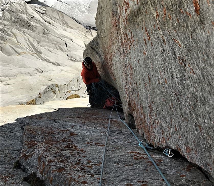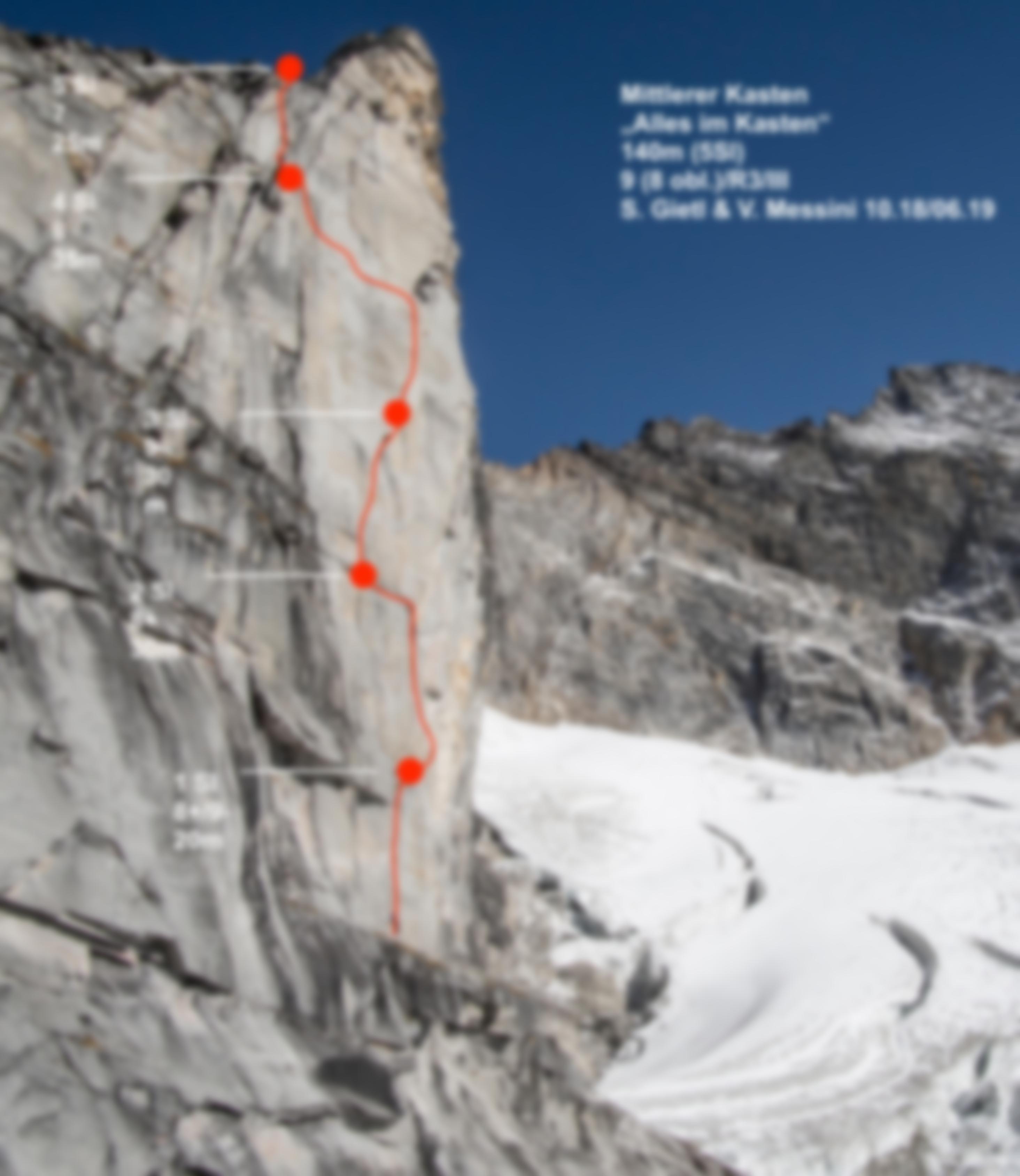 Schwierige Neutour in der Mitte des Geneispfeilers. Nach einem ganzen Tag Arbeit im Herbst 2018 gelang es Simon Gietl und Vittorio Messini, eine natürliche Linie zu finden, die nun klassisch abgesichert (Normalhaken und zum Großteil mobile Sicherungsmittel) bis zur Gratschulter hinaufführt. Die Rotpunkt-Begehung erfolgt im Juni 2019.