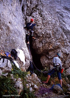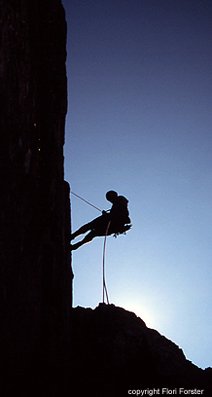 Helm, einige Klemmkeile und Friends, 10 Express, Bandschlingen, 50m Einfachseil (oder auch Doppelseil zum schnelleren Abseilen über Abseilpiste)