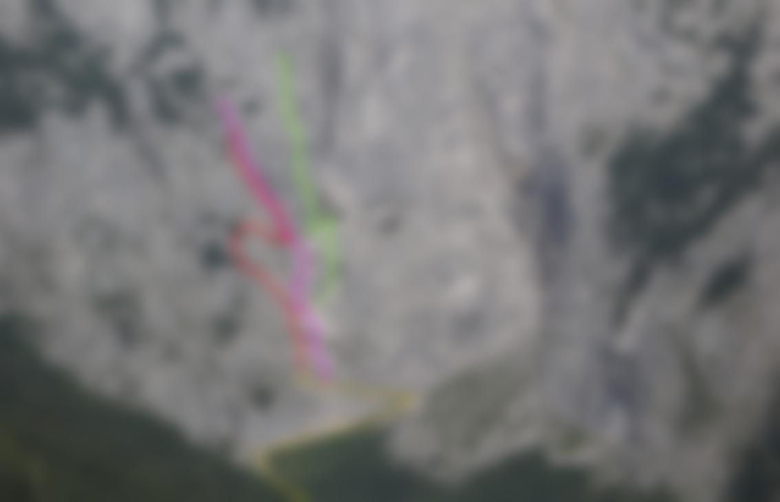 1. SL: Vom ersten Standhaken ca. 5 Meter nach rechts zu einer großen Schuppe, dort steckt ein Bohrhaken. Beim Bohrhaken leicht links haltend gerade hinauf über griffige Platten aufwärts. Später leicht nach rechts hinauf auf ein grasiges Band (roter Punkt), dort gerade oder leichter über rechts zum Stand auf einem Band (kurz vor dem ersten Band ist in der Platte rechts ein Abseilstand).