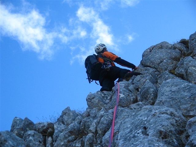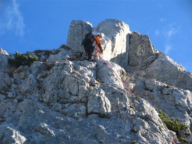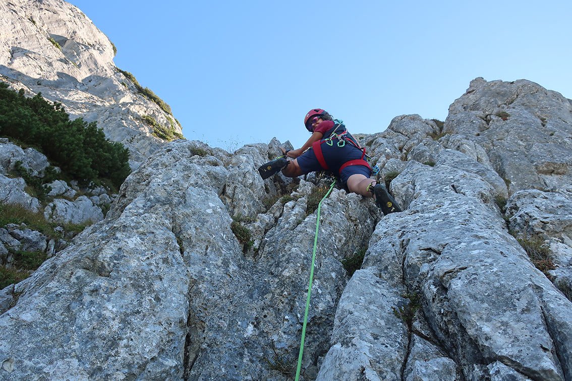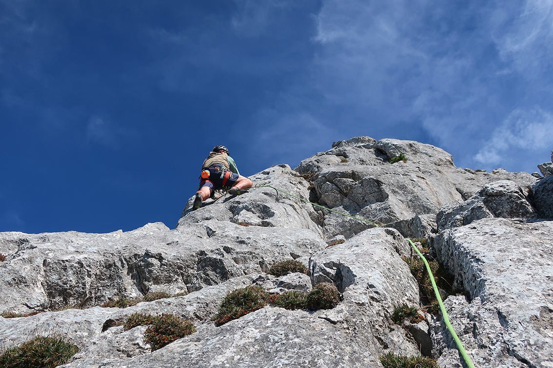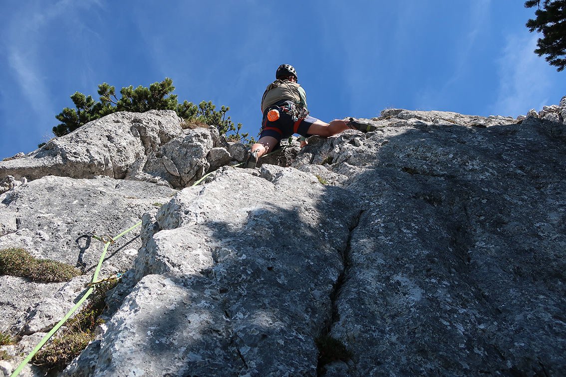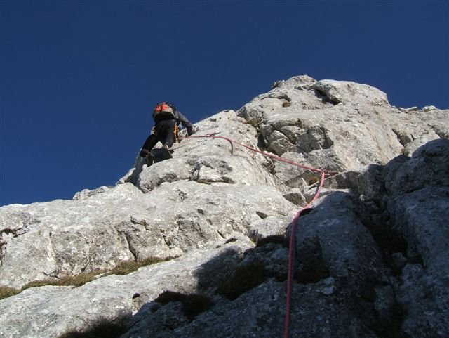 Der Anstieg ist für den Schwierigkeitsgrad gut mit Bohrhaken und Haken gesichert, in der ersten Seillänge sind die Abstände etwas weiter.