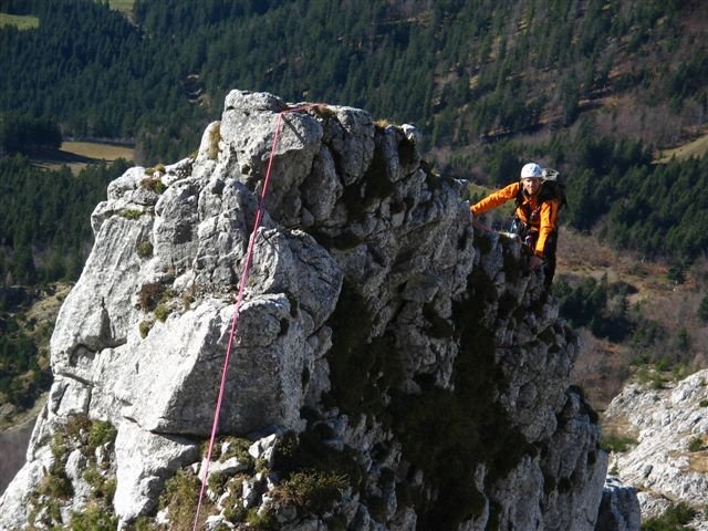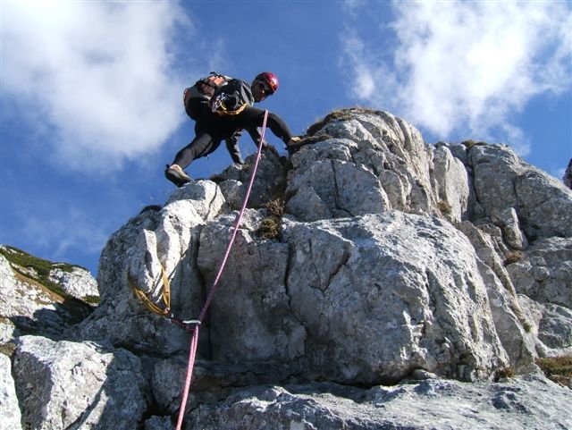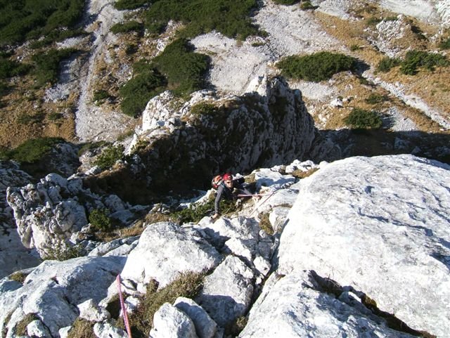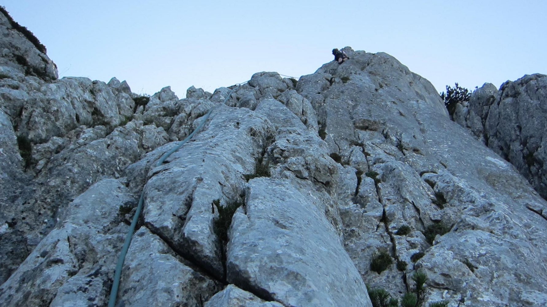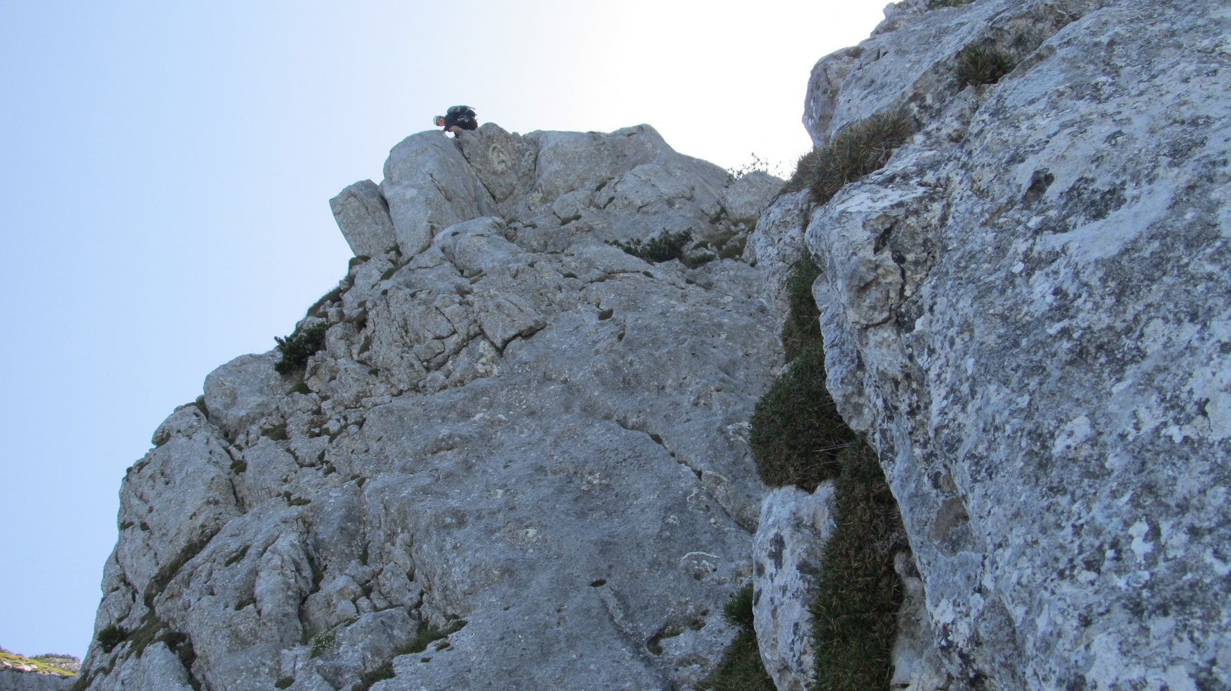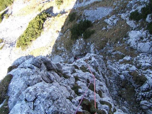 Der Anstieg ist für den Schwierigkeitsgrad gut mit Bohrhaken und Haken gesichert, in der ersten Seillänge sind die Abstände etwas weiter.