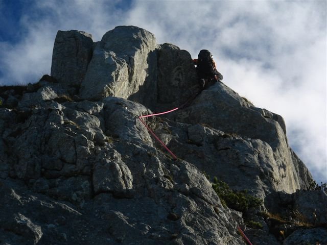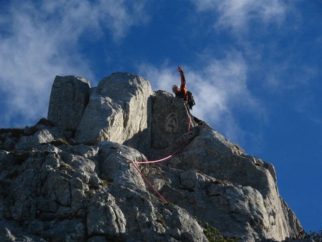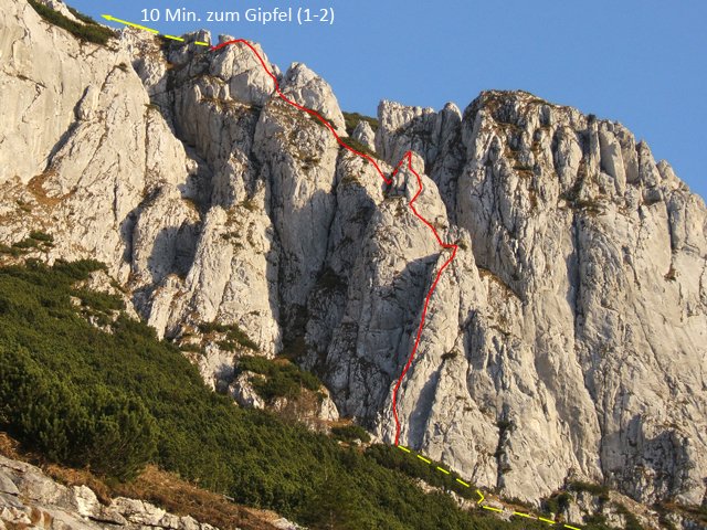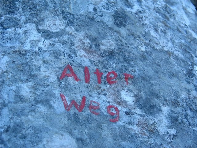 Der alte Weg - wie der Name schon sagt, handelt es sich um eine Route mit "alpin klassischem" Charakter. Im Mittelteil muss der Kletterer mit Latschen und Gras zurechtkommen, dafür bieten die Seillängen 1, 2, 4 und 6 wirklich schöne Kletterei in meist gutem Fels; die Kletterei ist auch recht abwechslungsreich, Gratpassagen, schöne Wandstellen und kleine, steile Felsstufen sind zu überwinden. Mit nur geringem Mehraufwand wird außerdem auch der perfekte Aussichtsgipfel erreicht. Die Route eignet sich zum Einstieg in das alpine Klettern, wobei der Kaltstart in die erste Seillänge besser vom erfahreneren Kletterer der Seilschaft begonnen wird.