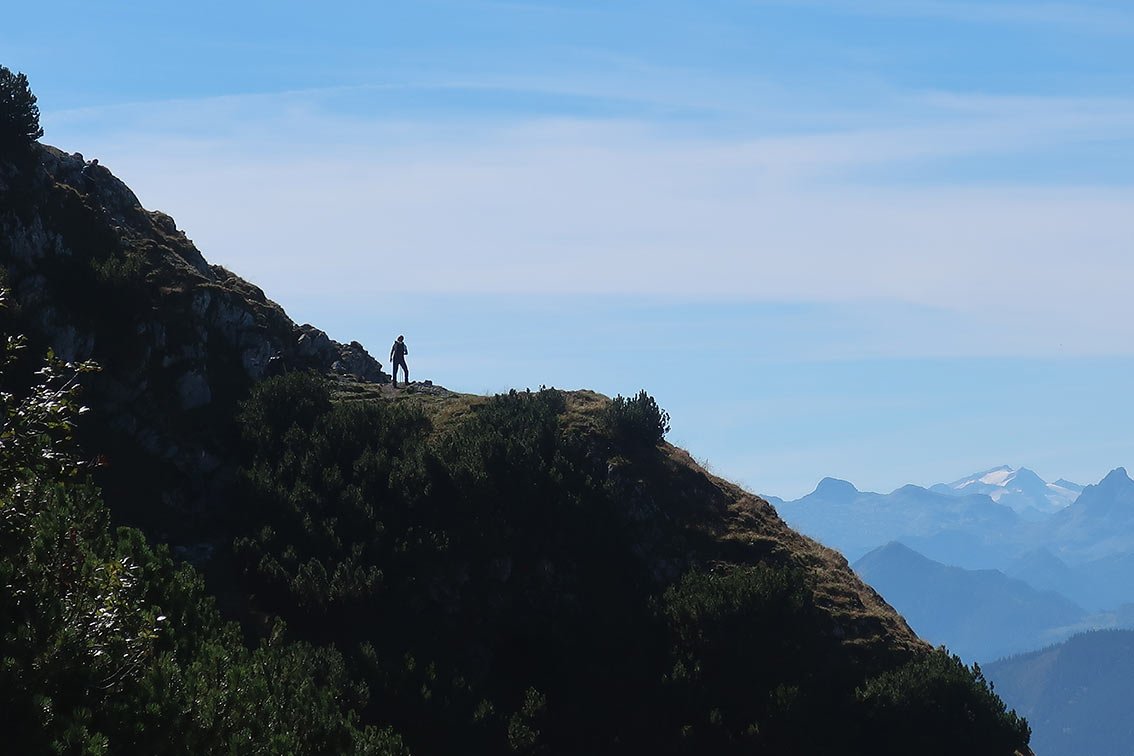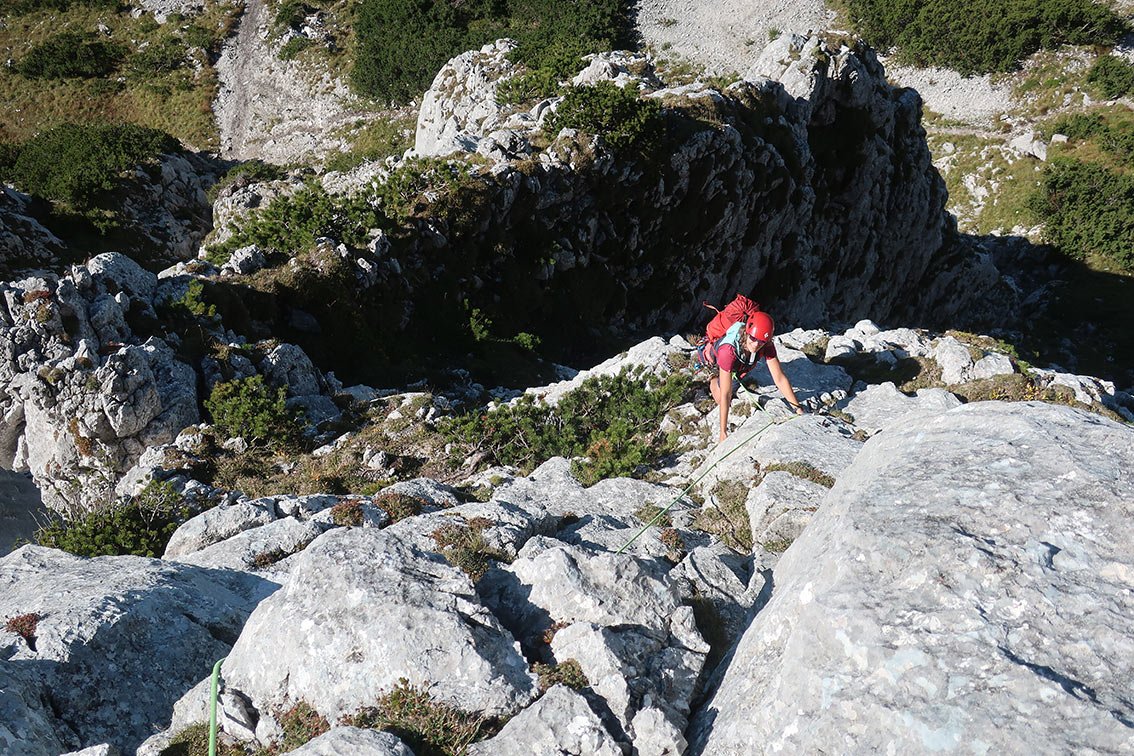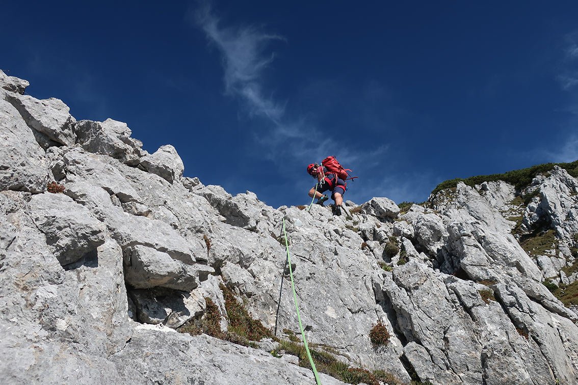 Stelle 4, meist III bis 4-, aber auch schrofiges und mit Gras durchsetztes Gelände.