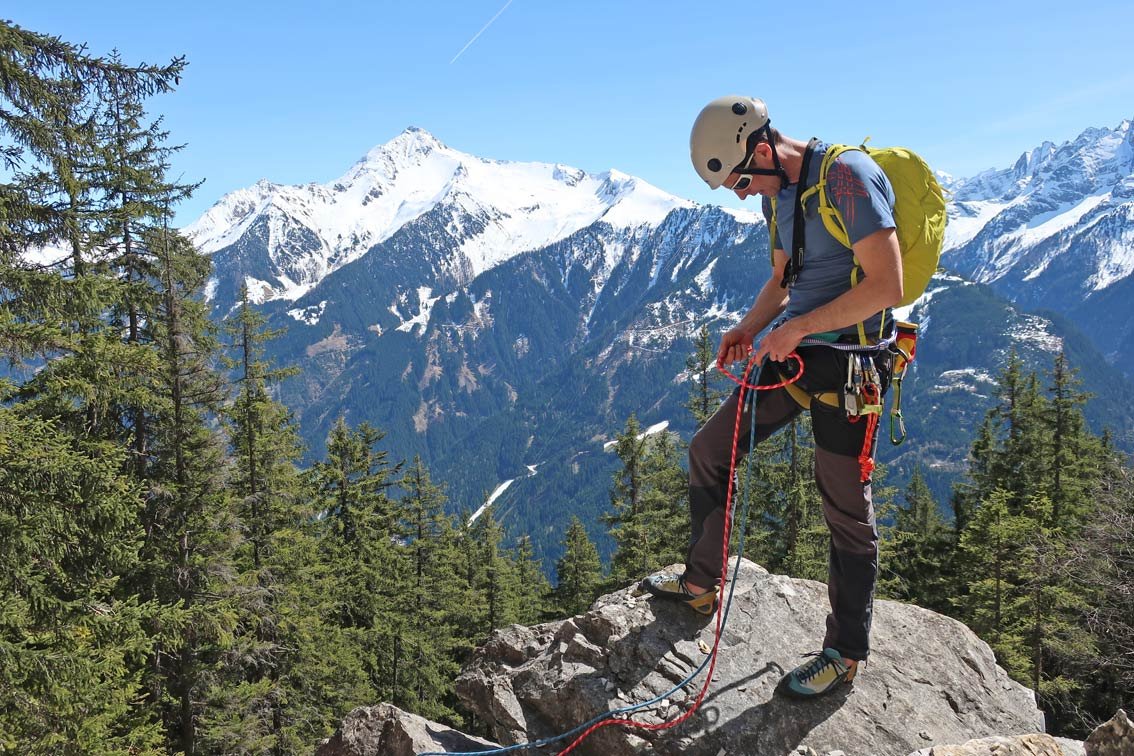 60 m Einfachseil, Helm und 10 Expressschlingen.