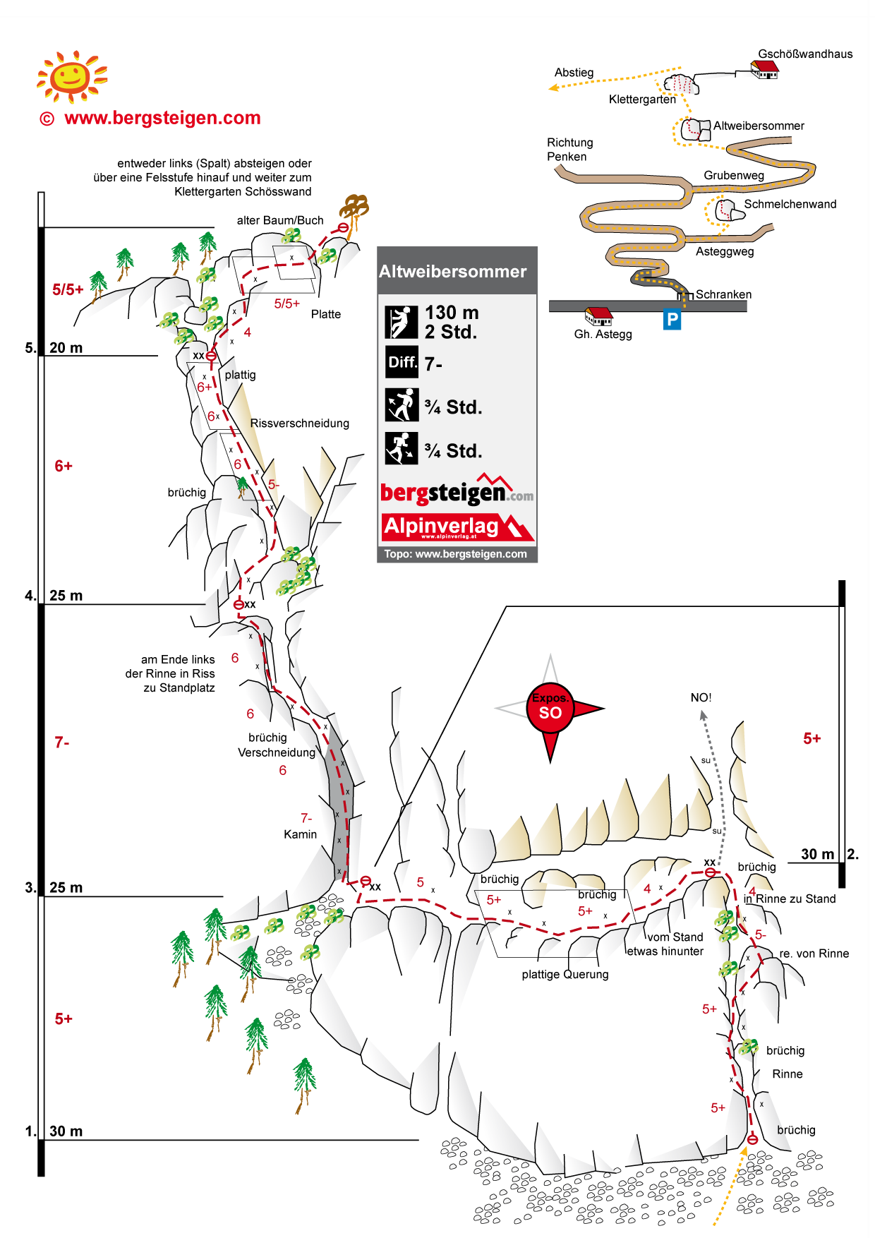 Gut mit dem "Altweibersommer" und dem Ausstieg im Klettergarten Gschößwand zu kombinieren - so kommt ein langer (12 Seillängen) Klettertag heraus. Diese Kombination wird von den Einheimischen "Umweg zum Gschöß" genannt.