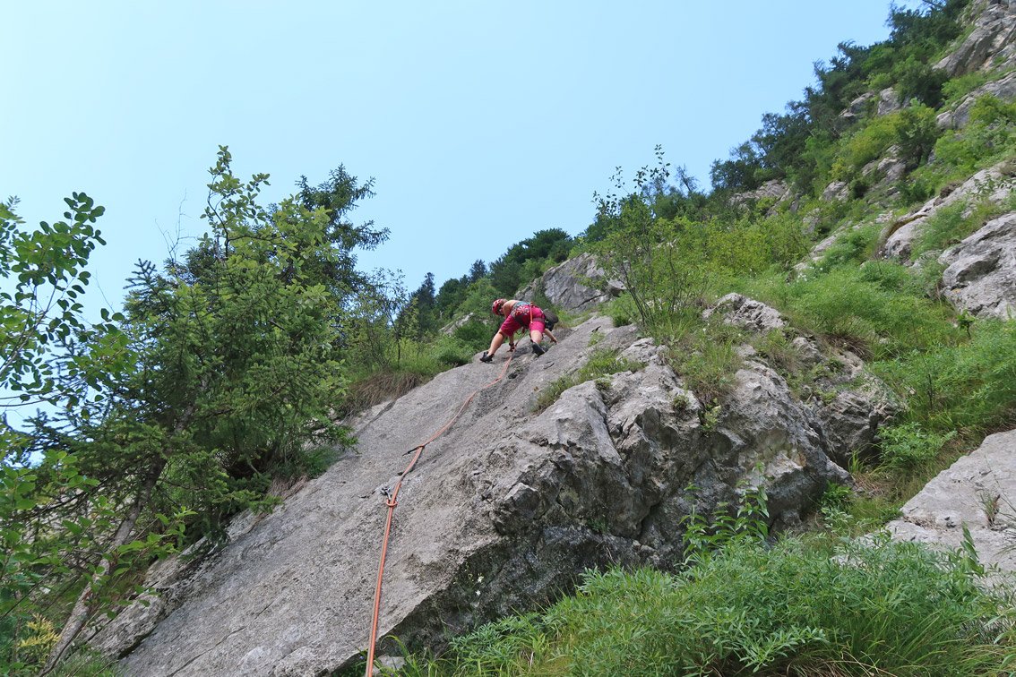 Bohrhaken zum Sau fuattern - so könnte man es nennen, wenn beim Knie, bei der Hüfte und beim Kopf ein Bohrhaken steckt. Kompliment, die Erstbegeher haben sehr gute Arbeit geleistet! Es macht richtig Spaß, entspannt fünf Seillängen nach oben zu klettern. Zu Beginn der 4. Seillänge ist Konzentration erforderlich (beim zweiten Haken sollte man einen Sturz vermeiden, allerdings ist es dort mit ca. 4/4+ eher leicht). Perfekte, sehr gut installierte Mehrseillängentour, die man aufgrund des kurzen Zustieges fast im Vorbeifahren, aber auch bei unsicherem Wetter machen kann. „An Reini Seini“ gehört zu den besten, leichteren Mehrseillängentouren in Weißbach bei Lofer!