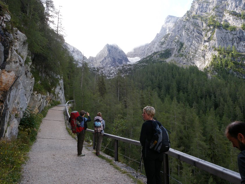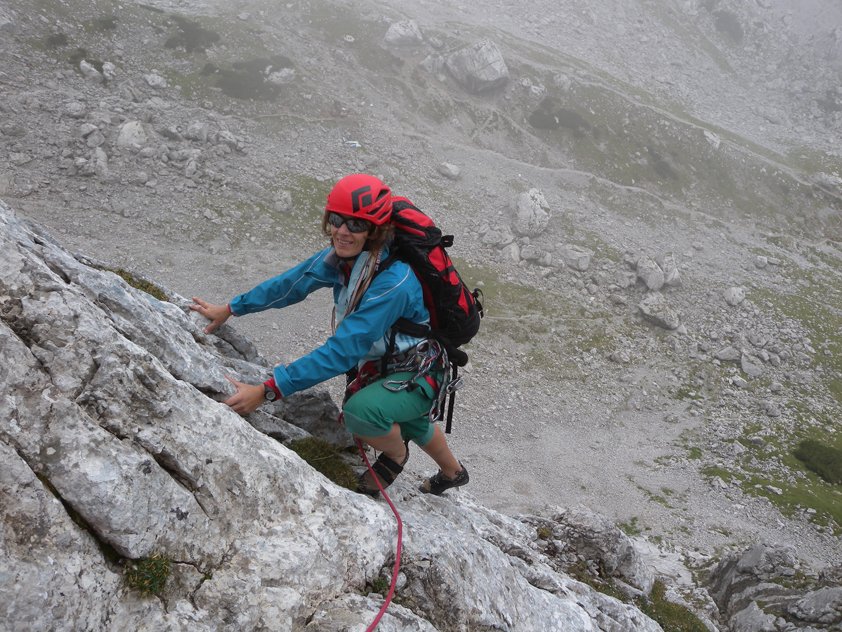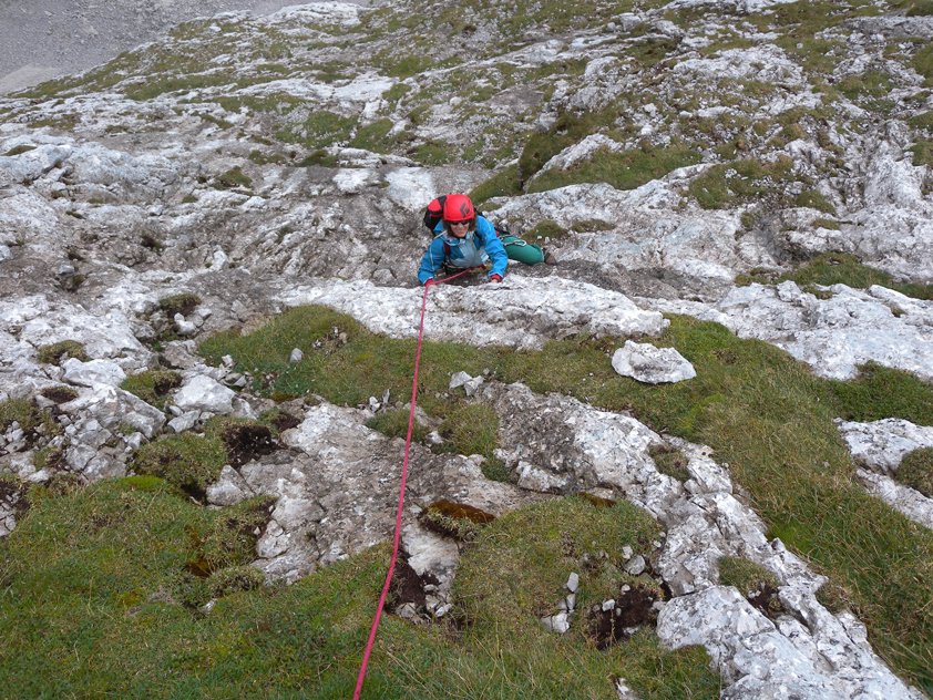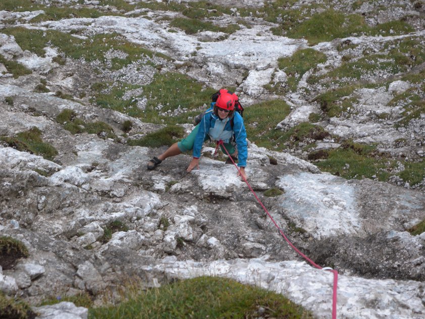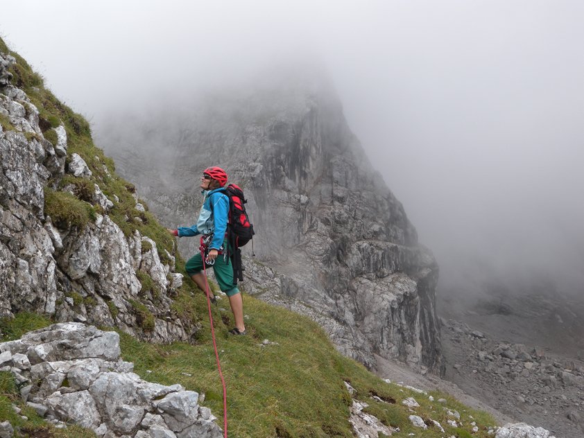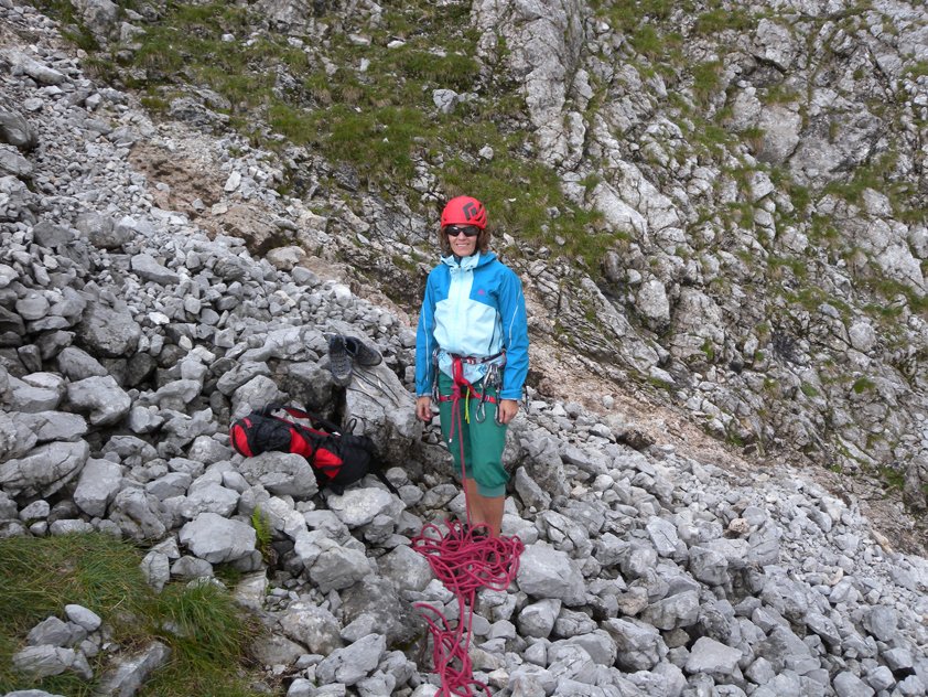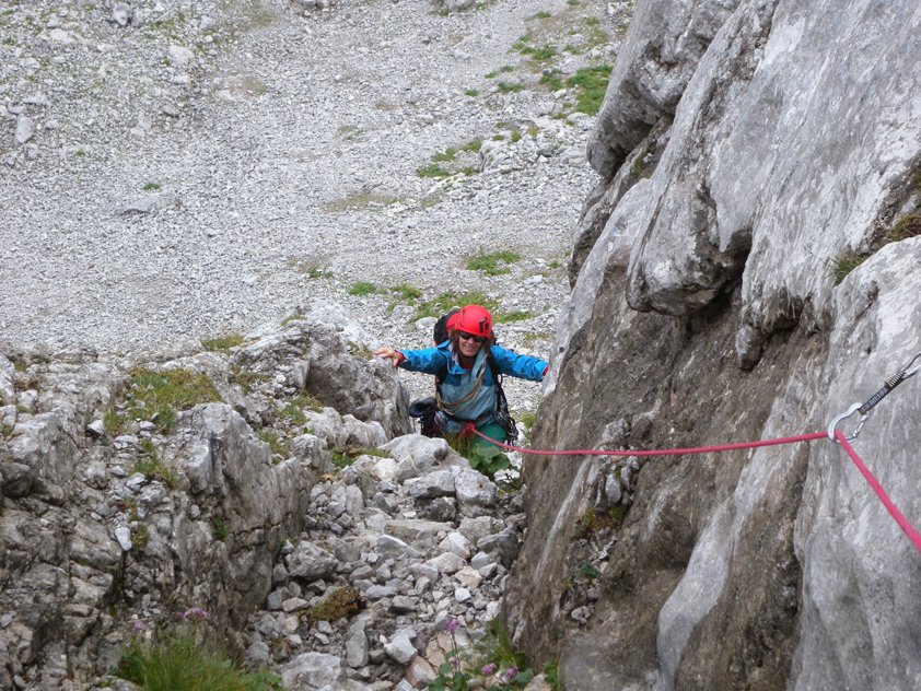 Im Wandbereich sofort den Steinschlaghelm aufsetzen, oft kommen Steine von "Normalweggehern" runter.
