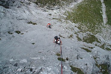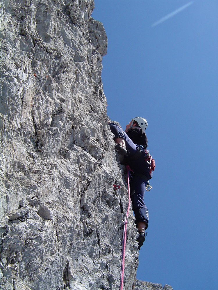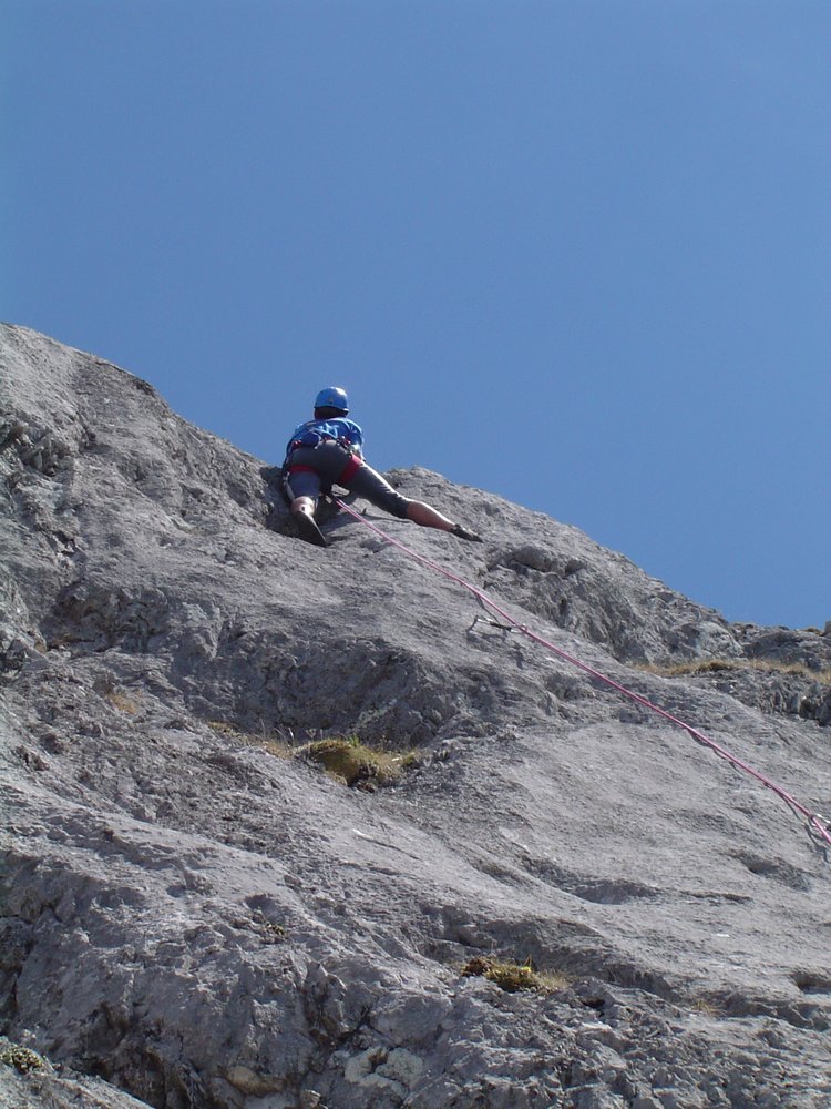 Wer auf den Gipfel verzichten will, kann vom 3. Sporn auch abseilen, wobei auf nachkommende Seilschaften geachtet werden sollte. Siehe Wandfoto mit Linienführung!