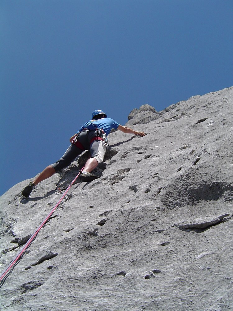 Doppelseil, 13 Expr. Schlingen, Bandschlingen und Helm! Die Route ist gut mit Haken abgesichert, in den leichteren Passagen sind jedoch weite Abstände. Keile und Freinds brauchbar.