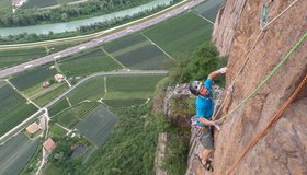 Wunderschöne Linie mit abwechselnd Riss- und Wandkletterei an bombenfestem Bozener-Quarzporphyr. Die Tour ist einzigartig in Tirol (ähnlich der Risskletterei in Utah).