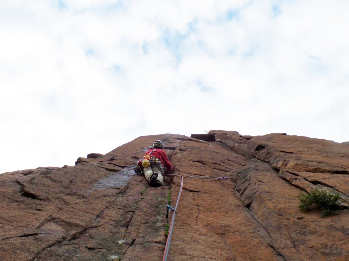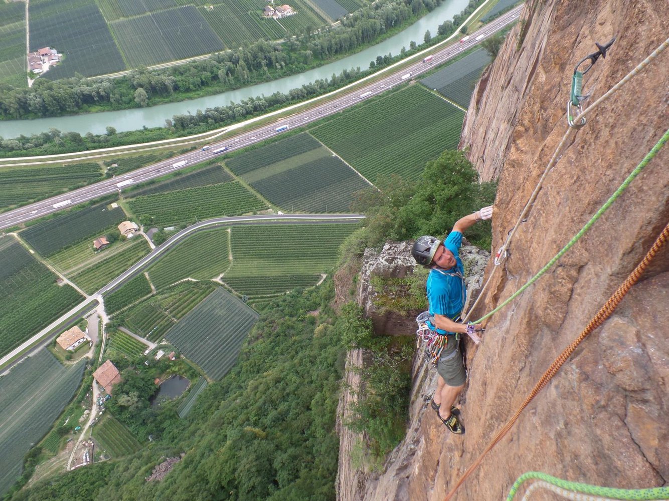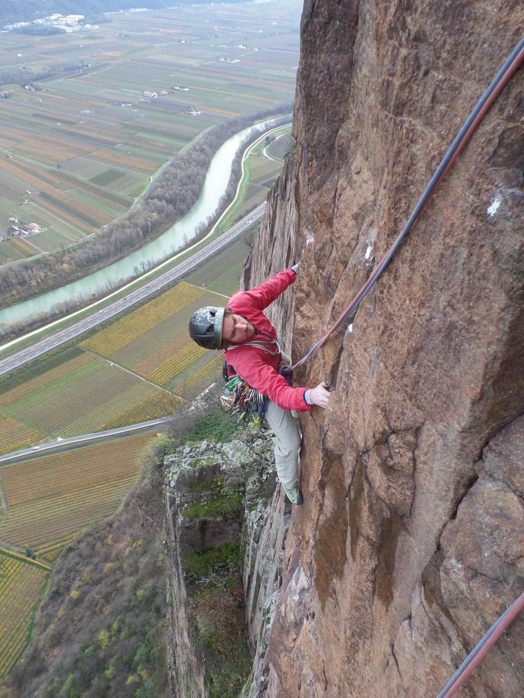 Wunderschöne Linie mit abwechselnd Riss- und Wandkletterei an bombenfestem Bozener-Quarzporphyr. Die Tour ist einzigartig in Tirol (ähnlich der Risskletterei in Utah).