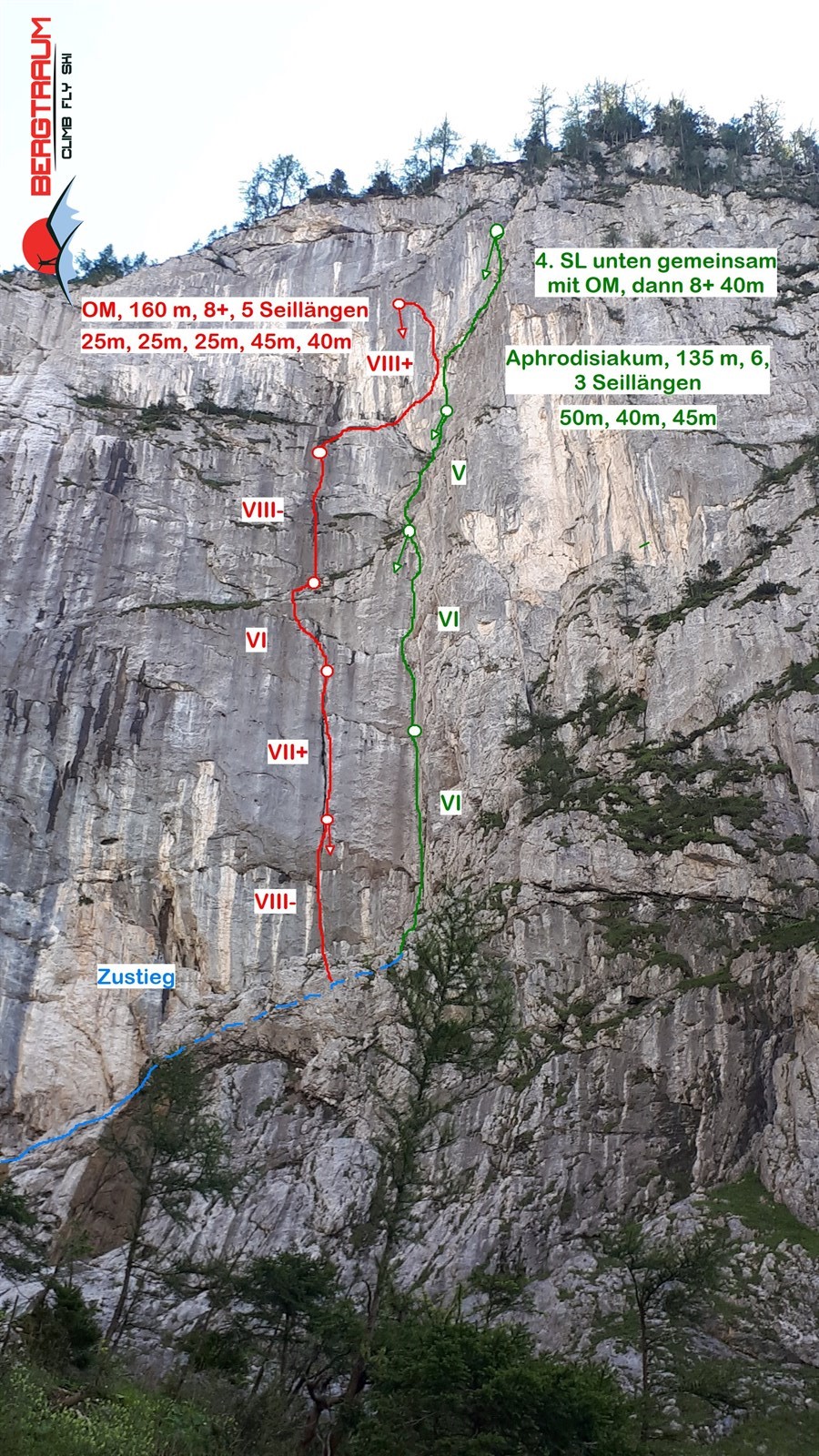 Gesamt 3 Seillängen: 6, 6, 5. Die oberste 4. Seillänge wäre dann zuerst 8+ (OM), und dann 5+.