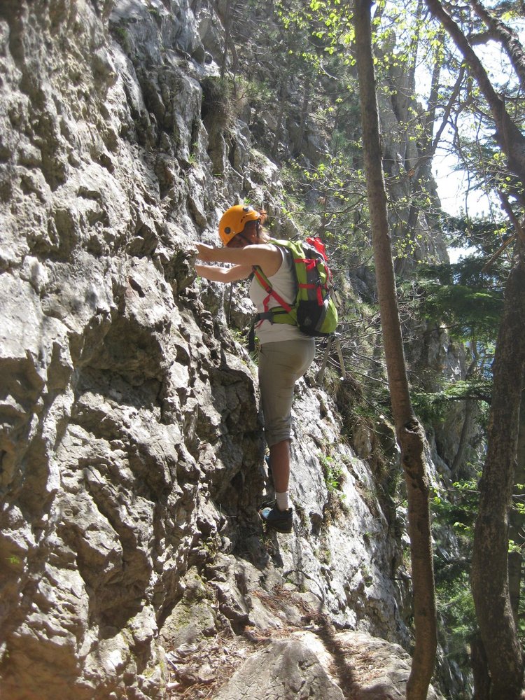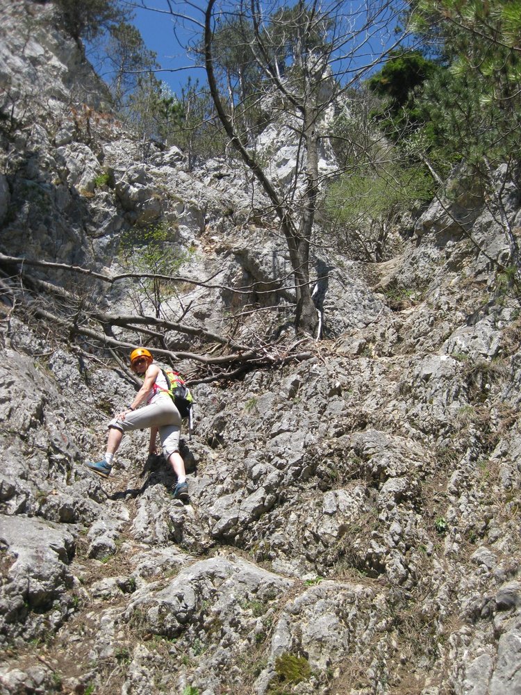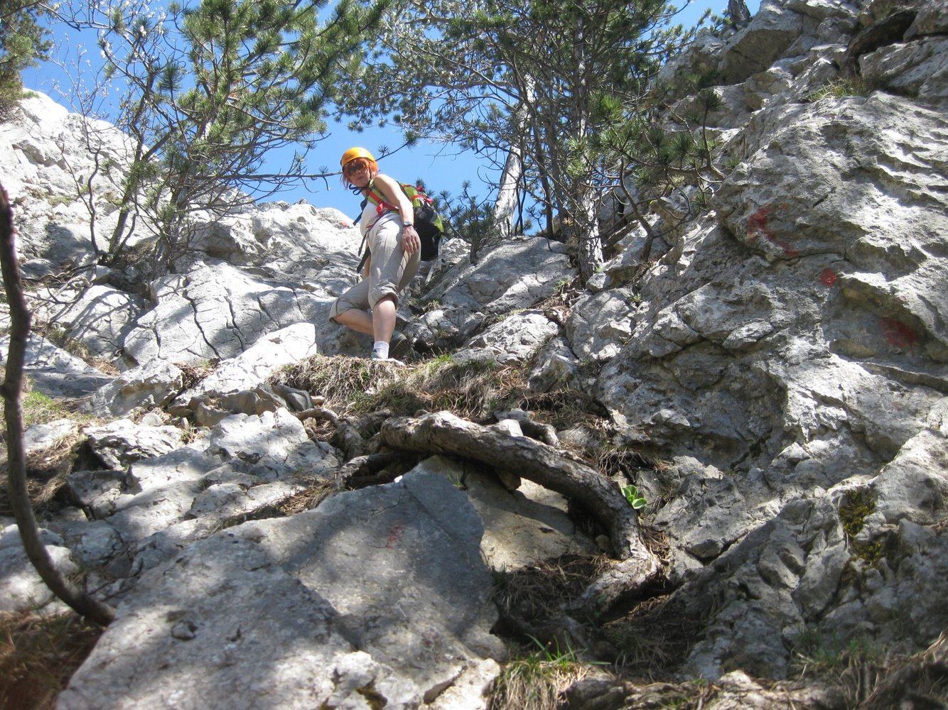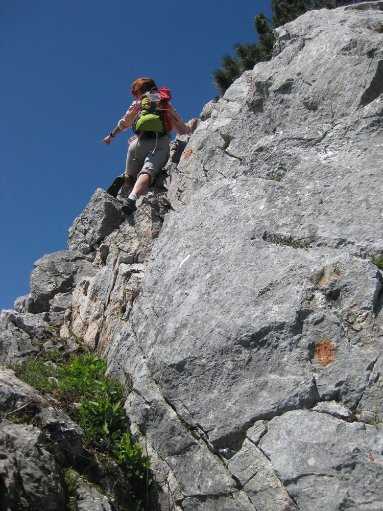 Abwechslungsreicher Steig, der einiges bietet: Eine plattige Felsrinne, unangenehme Erde, eine eindrucksvolle Höhle mit „Gamsbemmerl“, eine ausgesetzte Querung, wunderschöne Kletterstellen und einen netten leichten Grat. Die Kletterstellen weisen großteils festen Fels auf, wegen der Erdpassagen ist die Route jedoch nur bei Trockenheit zu empfehlen. Rote Markierungspunkte, Einstiegstafel.