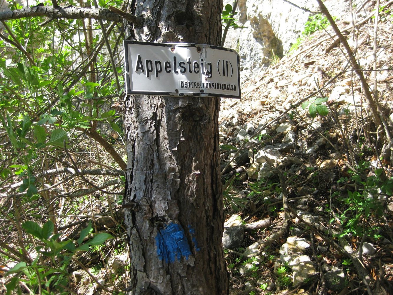 Vom Parkplatz auf der Straße zum Seiser Toni und auf dem grün markierten Binderweg zum Wandfuß. Hier wurde der Wandfußsteig von einer hässlichen Forststraße niedergewalzt (Stand Mai 2016). Der Wandfußsteig nach rechts zweigt jetzt schlecht erkennbar bei Felsblöcken von der obersten Forststraße ab (hier beginnt auch der „Trümmersteig“). Auf diesem Wandfußsteig 3 min nach rechts bis zur Abzweigung des Zahmen Pechersteigleins (blau markiert, Tafel). 30m rechts davon beginnt der Appelsteig bei einer erdigen Rinne (rot markiert, Tafel). (Etwas rechts vom Appelsteig beginnt der Enziansteig auf den ersten Turm, sozusagen die direkte Einstiegsvariante zum Appelgrat).