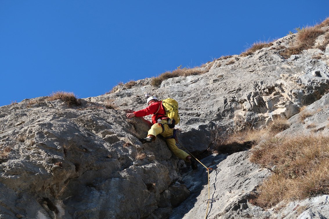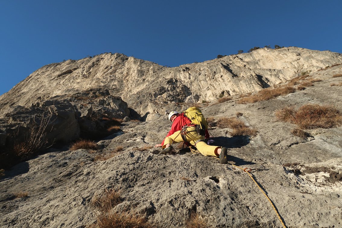 Die Route war anfangs tlw. brüchig und grasig („Magnesium brauchst keines, wenn du schwitzt, kannst du in die Erde greifen“). Das mit dem Bruch, dem Gras und der Erde ist mit der zunehmenden Zahl der Begeher deutlich besser geworden! Die Route gehört zu den leichteren Vorbaurouten.