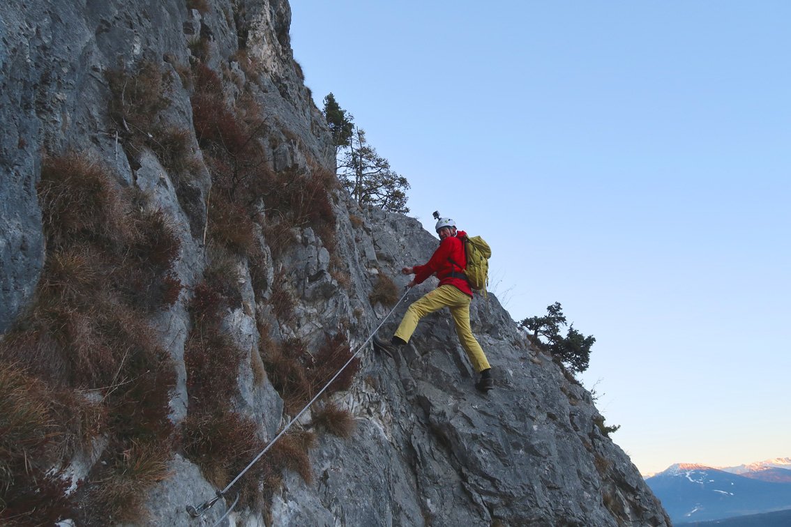 Vom Ende der Tour bei einem Haken quert man nach rechts zu einem Fixseil. Auf dem Fixseil hinauf (wenn es feucht ist, sehr heikel) und auf Bändern (Stellen 1, anfangs grüne, dann rote Markierung) bis zum Fußabstieg der Martinswand queren. Auf diesem zurück zum Parkplatz.
