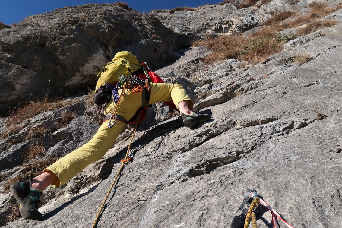 14 Expressschlingen und HELM nicht vergessen. Evtl. 2 kurze Bandschlingen oder längere Expressschlingen um die Seilführung in der dritten Seillänge etwas zu verbessern (sonst etwas Seilreibung für den Vorsteiger).