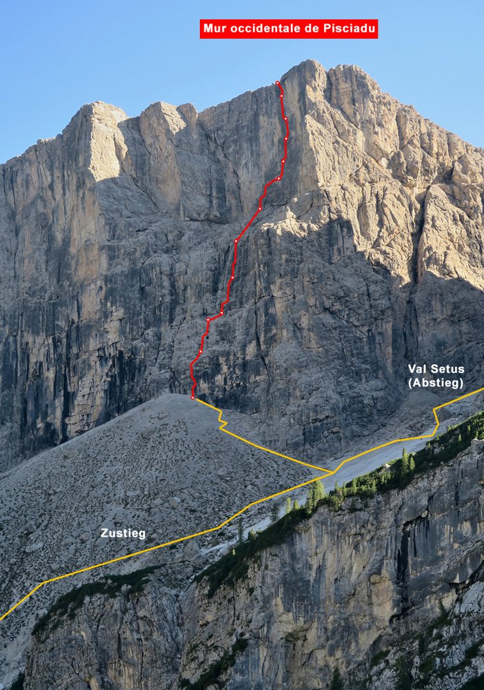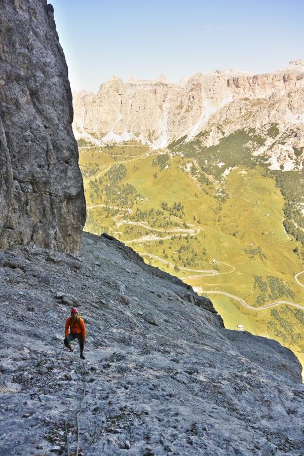 Sportkletterklassiker am Pisciadu Massiv - wie der Name schon sagt sollte man aber trockene Verhältnisse abwarten. Wenn der Fels aber trocken ist steht dem Genuss (bis auf wenige Passagen sehr guter Fels) an dieser 11 Seillängentour nichts mehr im Wege. Der einfache Zu- und Abstieg macht die Tour recht beliebt, die Nordwand ist ideal an wärmeren Sommertagen.