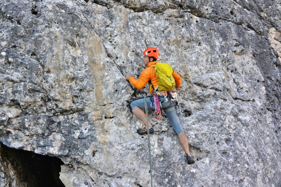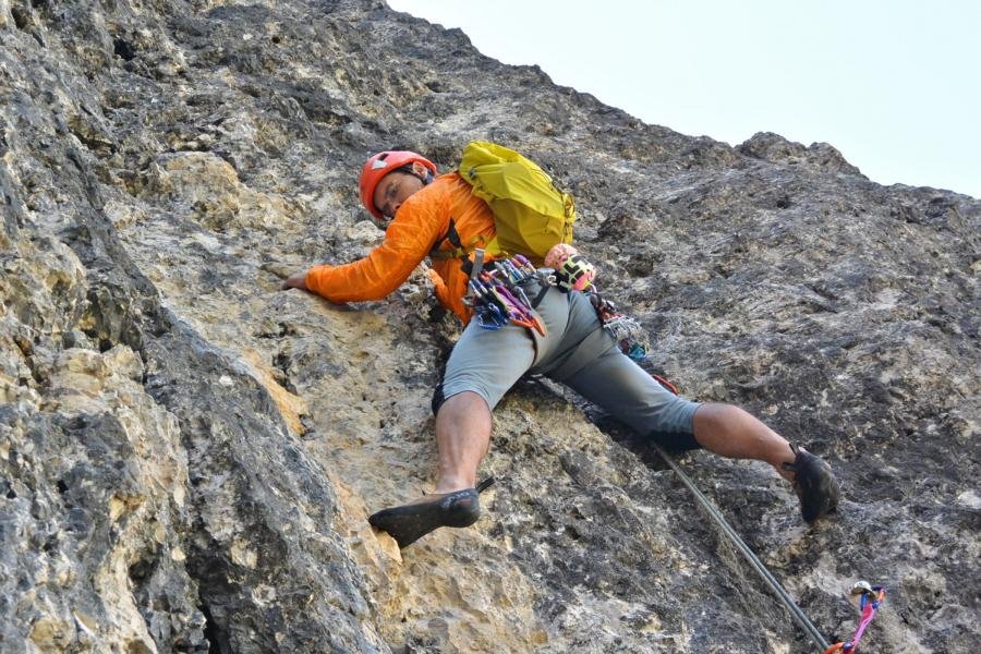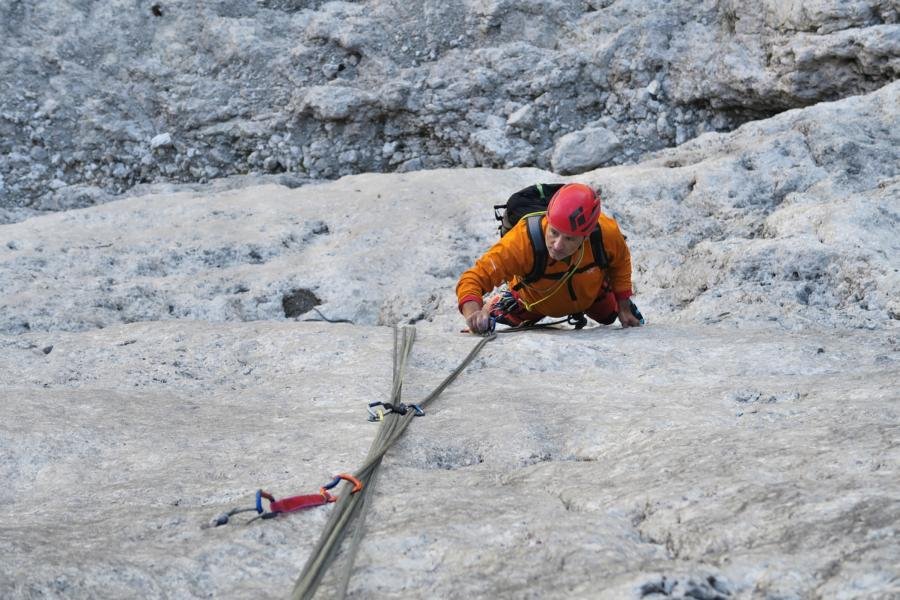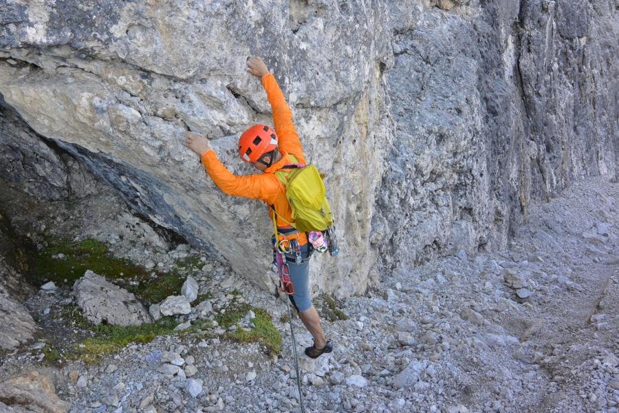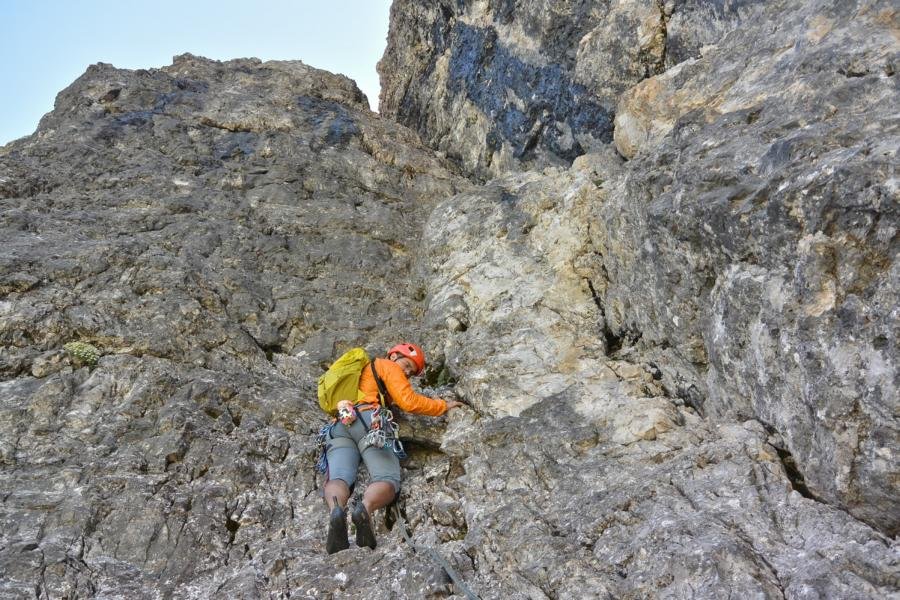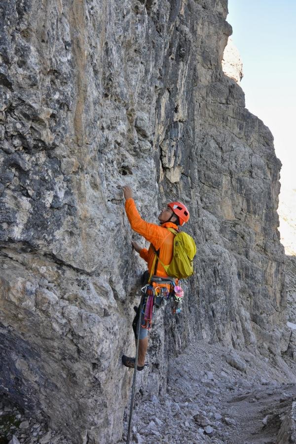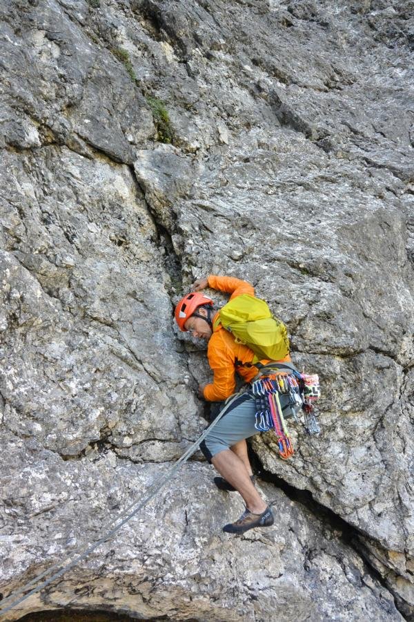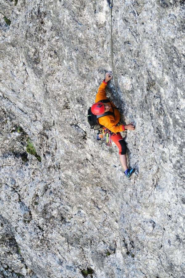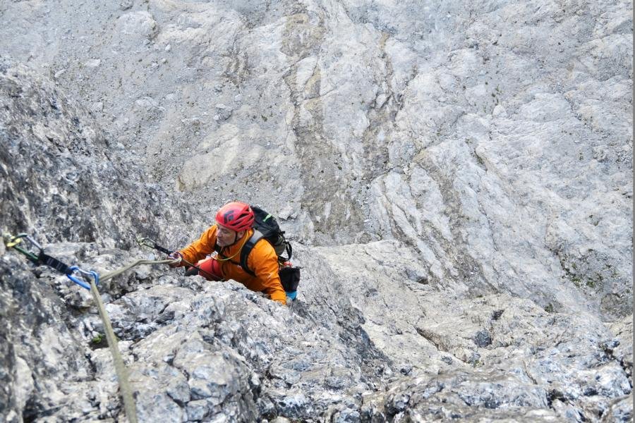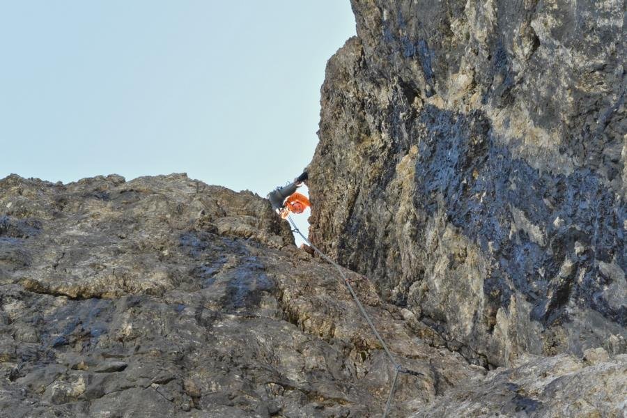 Für Dolomitenverhältnisse gut mit Bohrhaken abgesichert - in den leichten Seillängen aber durchaus weitere Abstände.