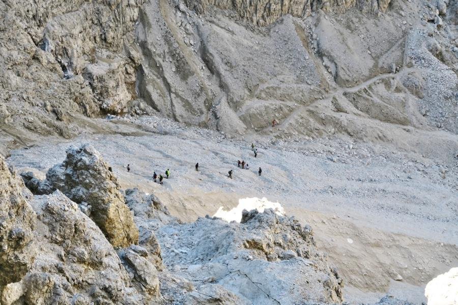 Auf dem Plateau etwas auf- und absteigend in Richtung Süden bis man auf den Wanderweg trifft. Dort links zur Pisciadu-Hütte (ca. 5 Min.) oder gleich rechts durch das Val Setus hinunter (einige kurze Steilstufen sind mit Stahlseilen gesichert) zum Parkplatz.