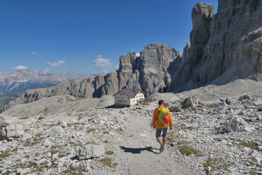 Vom Klettersteigparkplatz folgt man dem Weg in Richtung Pisciadu-Hütte/Val Setus. Nach etwa 20 Minuten (auf ca. 2170) verlässt man den Weg und geht nach links unter die Wand zum Einstieg.